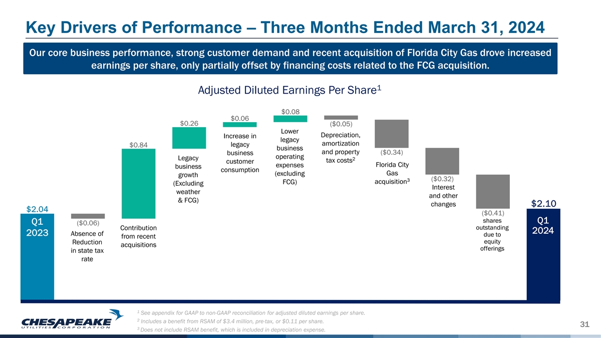 业绩的关键驱动因素–截至2024年3月31日止三个月,我们的核心业务业绩、强劲的客户需求以及最近对Florida City Gas的收购推动了每股收益的增长,但仅部分被与收购FCG相关的融资成本所抵消。1调整后稀释每股收益降低折旧、遗留摊销增加遗留业务和物业业务运营遗留2税收成本客户费用佛罗里达州城市业务消费天然气(不包括增长3收购FCG)(不包括利息天气和其他& FCG)(不包括利息天气和其他& TERM1)变化股份Q1 Q1未偿贡献20242023由于最近的股权减少收购发行州税率1调整后稀释每股收益的GAAP与非GAAP对账情况见附录。2包括340万美元的RSAM收益,税前,或每股0.11美元。313不包括RSAM收益,计入折旧费用。
