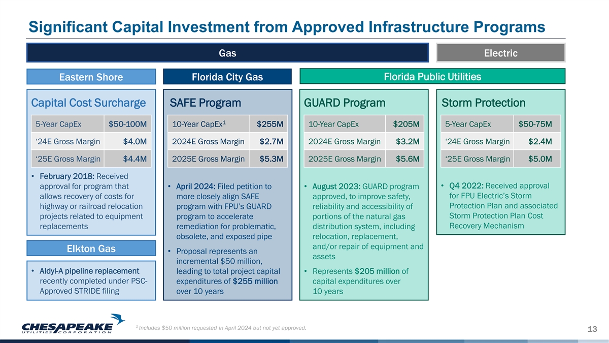 支持增长项目和客户计划的积极监管时间表已获批准,正在审查中的三个特拉华州能源项目:1.06亿美元项目:1.26亿美元+效率计划75 •家庭能源咨询和检查(HEC)、Home Newberry扩张、资本支出:伍斯特弹性资本支出:与Energy Wildlight Phase 2~2800万美元升级项目的绩效~8000万美元之星(惠普)和与能源之星(AHP)的辅助家庭绩效•旨在实现成本-Boynton Beach & Indian River RNG、有效能源和需求资本支出:资本支出:New Smyrna Beach Brevard RNG,& Delaware Natural节省~3600万美元~4600万美元天然气客户管道Medley RNG •集体,这些项目估计将节省相当于Lake Mattie年能源使用量的天然气消耗,资本支出:Pioneer Supply资本支出:约10551 Plant City,& St. Cloud~4200万美元的Header Pipeline N/A家庭。1 Pioneer Supply Header Pipeline总资本支出尚未披露。2024年5月12日Q1 2024 Q4 2023 Q1 2024 Q1 2024 Q3 2023