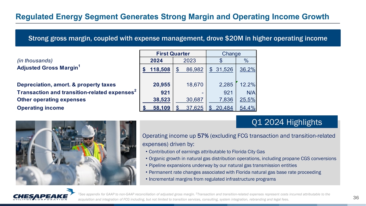 受监管能源部门产生强劲的利润率和营业收入增长强劲的毛利率,加上费用管理,推动营业收入增加2000万美元第一季度变化(以千为单位)20242023$% 1调整后毛利率118,508美元86美元,982美元31,526美元36.2%折旧,摊销。&财产税20,95518,6702,28512.2% 2交易和过渡相关费用921-921 N/A其他运营费用38,52330,6877,83625.5%营业收入$ 58,109 $ 37,625 $ 20,48454.4% 2024年第一季度亮点营业收入增长57%(不包括FCG交易和过渡相关费用)的推动是:•佛罗里达州城市燃气贡献的收益•天然气分销业务的有机增长,包括丙烷CGS转换•我们的天然气输送实体正在进行的管道扩建•与佛罗里达州天然气基准费率程序相关的永久费率变化•受监管的基础设施计划带来的增量利润率12调整后毛利率的GAAP与非GAAP调节见附录。交易和过渡相关费用指因36收购和整合FCG而发生的成本,包括但不限于过渡服务、咨询、系统集成、品牌重塑和法律费用。