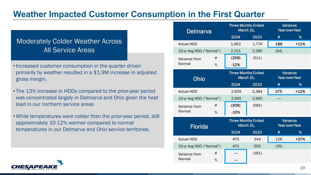 天气影响第一季度客户消费三个月结束差异3月31日,同比Delmarva 20242023#%实际HDD中的适度寒冷天气1,9621,774188 + 11%所有服务区10年平均HDD(“正常”)2,2222,285(64)#(259)(511)与正常%-12 %•主要受天气驱动的本季度客户消费增加导致调整后的3月31日结束的三个月差异毛利率同比增加190万美元。俄亥俄州20242023#%实际HDD 2,6592,384275 + 12% •考虑到高温10年平均HDD(“正常”)2,9652,965---我们北部服务区的负荷,HDD与去年同期相比增加13%主要集中在德尔马瓦和俄亥俄州#(306)(581)与正常%-10 %•虽然气温比去年同期更冷,但与3月31日的正常情况相比,三个月结束的差异仍然比我们德尔马瓦和俄亥俄州服务区的佛罗里达州气温同比高出约10-12 %。20242023#%实际HDD 470344126 + 37% 10年平均HDD(“正常”)470505(35)#---(161)与正常%---39的差异