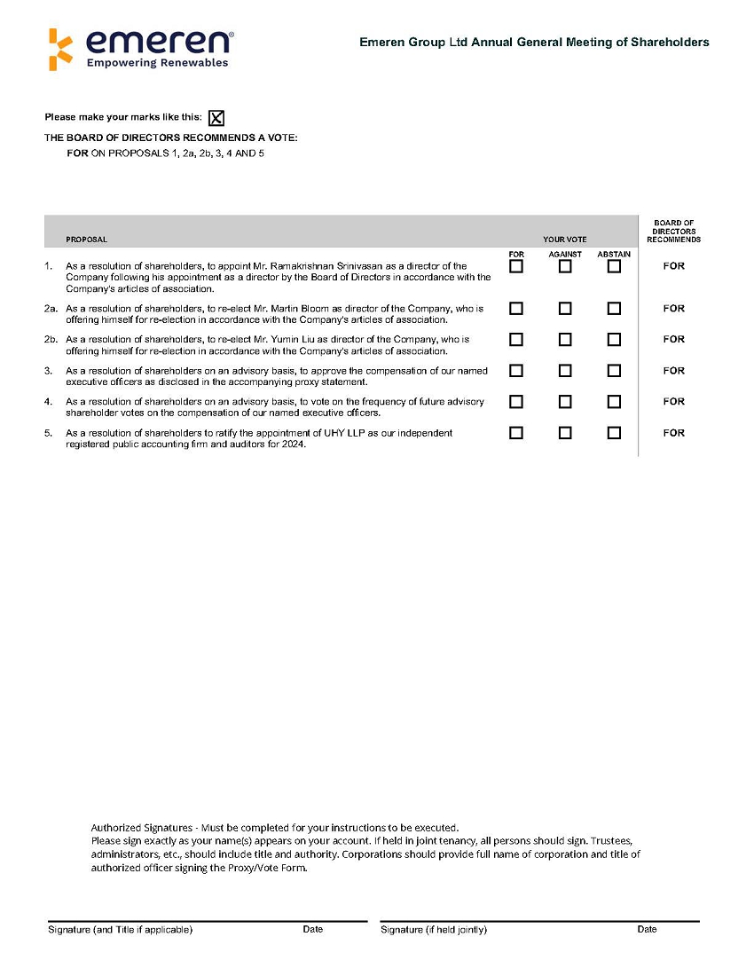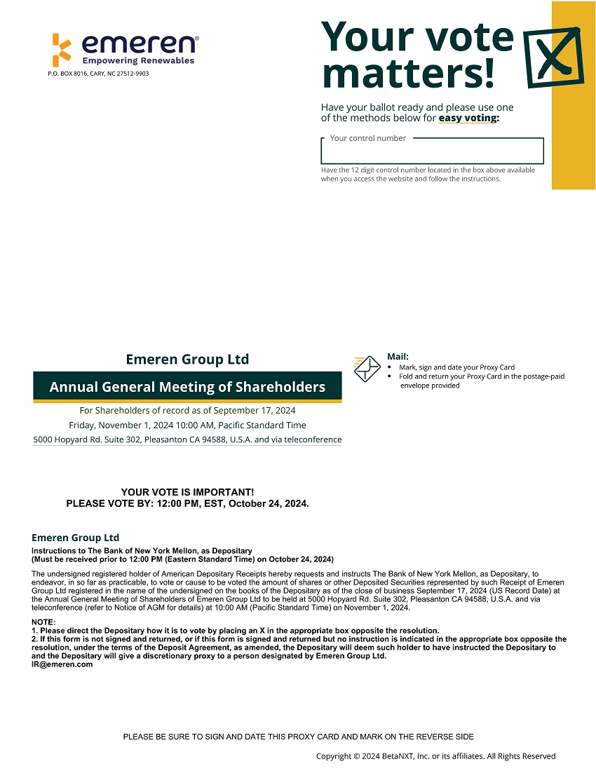 P.O. BOX 8016,CARY,NC 27512-9903您的投票很重要!准备好您的选票,请使用以下方法之一进行轻松投票:您的控制号码当您访问网站并按照说明进行操作时,请拥有位于上面方框中的12位控制号码。Emeren Group Ltd.年度股东大会,供截至2024年9月17日(星期五)上午10:00,Pacific Standard Time 5000 Hopyard Rd. Suite 302,Pleasanton 加利福尼亚州 94588,U.S.A.和通过电话会议邮寄:•在您的代理卡上做标记、签名并注明日期•将您的代理卡折叠起来并寄回您提供的已付邮资信封投票很重要!请在:2024年10月24日美国东部时间下午12:00前投票。Emeren Group Ltd指示作为存托人的纽约梅隆银行(必须在2024年10月24日下午12:00(东部标准时间)之前收到)以下签名的美国存托凭证登记持有人特此请求并指示作为存托人的纽约梅隆银行尽最大努力,在将于2024年11月1日上午10:00(太平洋标准时间)在美国Pleasanton 加利福尼亚州 94588的5000 Hopyard RD. Suite 302举行的瑞能新能源公司 Ltd年度股东大会上,投票或促使投票表决截至2024年9月17日(美国记录日期)收市时在存托人账簿上登记在以下签署人名下的该等收据所代表的股份或其他存托证券的数量。注:1。请指示保存人如何投票,方法是在决议对面的适当方框中放置一个X。2.如果未签署并交回此表格,或者如果已签署并交回此表格但未在决议对面的相应方框中注明指示,根据经修订的存款协议条款,存托人将视为该持有人已指示存托人,存托人将全权委托给由Emeren Group Ltd. IR@emeren.com指定的人。请务必在反面签名并注明此代理卡和标记的日期版权所有© 2024 BetaNXT,Inc.或其关联公司。版权所有 |