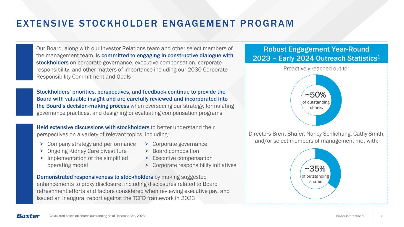 8Baxter International 2023年全年稳健参与– 2024年初外联统计数据1我们的董事会与我们的投资者关系团队和管理团队的其他精选成员一起,致力于与股东就公司治理、高管薪酬、公司责任以及其他重要事项(包括我们的2030年公司责任承诺和目标)进行建设性对话,股东的优先事项、观点和反馈继续为董事会提供宝贵的见解,并在监督我们的战略、制定治理实践时仔细审查并纳入董事会的决策过程,并主动设计或评估薪酬方案与:~50%的流通股董事Brent Shafer、Nancy Schlichting、Cathy Smith和/或管理层的精选成员会面:~35%的流通股与股东进行了广泛的讨论,以更好地了解他们对各种相关话题的看法,包括:>公司战略和业绩>正在进行的肾脏护理剥离>实施简化运营模式>公司治理>董事会组成>高管薪酬>公司责任倡议通过对代理披露进行建议的改进来展示对股东的响应能力,包括与董事会更新努力和审查高管薪酬时考虑的因素相关的披露,并在2023年EXT ENSIVE STO C K HO L DER ENG AGEMENT P RO GR A M发布了一份针对TCFD框架的就职报告,该报告是根据截至2023年12月31日的流通股计算得出的。