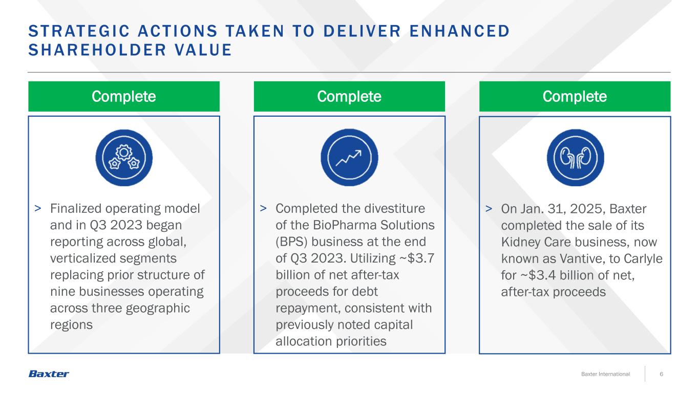 > 2025年1月31日,百特以约34亿美元的税后净收益完成向凯雷出售其肾脏护理业务(现称为Vantive)>于2023年第三季度末完成了生物制药解决方案(BPS)业务的剥离。将约37亿美元的税后净收益用于偿还债务,与之前提到的资本分配优先事项一致>最终确定的运营模式,并于2023年第三季度开始在全球、垂直细分市场进行报告,以取代之前在EGIC AC T IO NS TA K EN至DEL IVER ENHA NC ED SHA R EHO L DER VA LUE 6Baxter International Complete Complete Complete