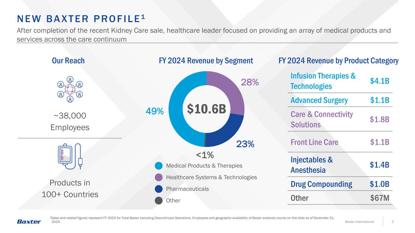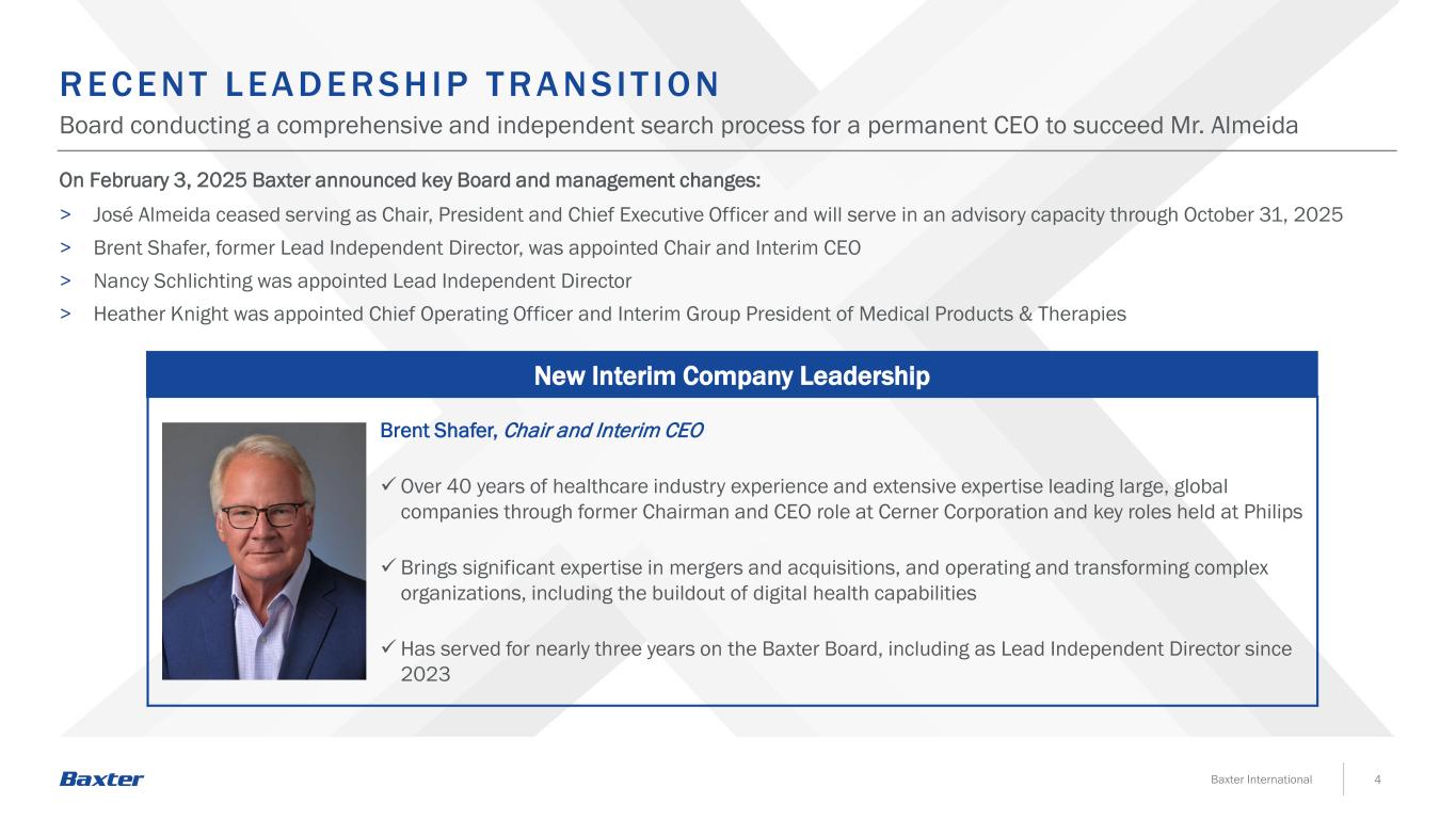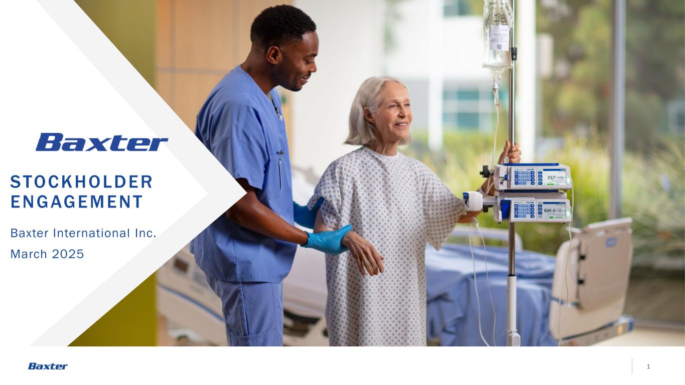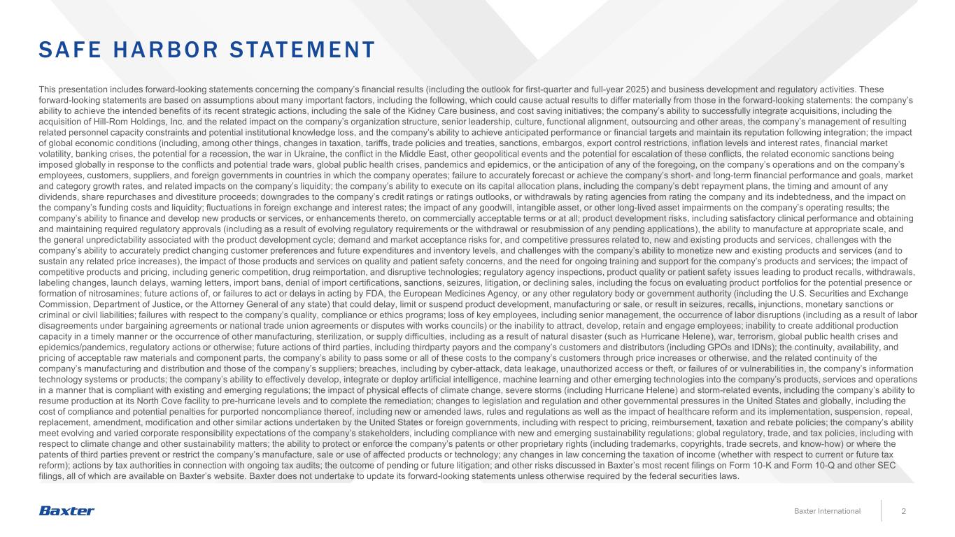 SA F E HA R BO R STAT EMENT 2Baxter International本演示文稿包含有关公司财务业绩(包括2025年第一季度和全年展望)以及业务发展和监管活动的前瞻性陈述。这些前瞻性陈述基于对许多重要因素的假设,其中包括以下因素,这些因素可能导致实际结果与前瞻性陈述中的结果存在重大差异:公司实现其最近战略行动(包括出售肾脏护理业务和成本节约举措)的预期收益的能力;公司成功整合收购的能力,包括收购希尔罗控股,Inc.以及对公司组织结构、高级领导层、文化、职能调整、外包和其他领域的相关影响,公司管理层对由此产生的相关人员能力限制和潜在的机构知识损失,以及公司在整合后实现预期业绩或财务目标并维持声誉的能力;全球经济状况的影响(其中包括,税收、关税、贸易政策和条约、制裁、禁运、出口管制限制、通胀水平和利率、金融市场波动、银行业危机、经济衰退的可能性、乌克兰战争、中东冲突、其他地缘政治事件以及这些冲突升级的可能性,为应对冲突和潜在的贸易战、全球公共卫生危机、大流行病和流行病而在全球范围内实施的相关经济制裁,或对公司运营以及公司员工、客户、供应商和公司经营所在国外国政府的任何上述情况的预期;未能准确预测或实现公司的短期和长期财务业绩和目标、市场和品类增长率,以及对公司流动性的相关影响;公司执行资本分配计划的能力,包括公司的债务偿还计划,任何股息、股份回购和剥离收益的时间和金额;下调公司信用评级或评级展望,或评级机构撤回对公司及其债务的评级,以及对公司资金成本和流动性的影响;外汇和利率波动;任何商誉、无形资产或其他长期资产减值对公司经营业绩的影响;公司以商业上可接受的条款或根本没有融资和开发新产品或服务的能力,或对其进行增强;产品开发风险,包括令人满意的临床表现以及获得和维持所需的监管批准(包括由于不断变化的监管要求或撤回或重新提交任何未决申请)、以适当规模生产的能力,以及与产品开发周期相关的一般不可预测性;新产品和现有产品和服务的需求和市场接受风险以及与之相关的竞争压力,公司准确预测不断变化的客户偏好以及未来支出和库存水平的能力面临挑战,以及公司将新的和现有的产品和服务货币化的能力(以及维持任何相关的价格上涨)的挑战,这些产品和服务对质量和患者安全问题的影响,以及对公司产品和服务的持续培训和支持的需求;竞争性产品和定价的影响,包括仿制药竞争、药物再进口和颠覆性技术;监管机构检查、产品质量或患者安全问题导致产品召回、撤回、标签更改、上市延迟、警告信、进口禁令、拒绝进口认证、制裁、扣押、诉讼或销量下降,包括重点评估产品组合是否存在亚硝胺的潜在存在或形成;FDA、欧洲药品管理局或任何其他监管机构或政府当局(包括美国证券交易委员会、司法部或任何州的总检察长)未来可能延迟、限制或暂停产品开发、制造或销售,或导致扣押、召回、禁令、金钱制裁或刑事或民事责任的行动、未采取行动或延迟采取行动;公司质量、合规或道德计划方面的失败;包括高级管理层在内的关键员工的流失, 发生劳资中断(包括根据谈判协议或全国工会协议产生劳资分歧或与劳资委员会发生纠纷)或无法吸引、发展、留住和聘用员工;无法及时创造额外产能或发生其他制造、绝育或供应困难,包括由于自然灾害(如飓风海伦)、战争、恐怖主义、全球公共卫生危机和流行病/流行病、监管行动或其他原因;第三方的未来行动,包括第三方付款人以及公司的客户和分销商(包括GPO和IDN);持续性,可用性,以及可接受的原材料和零部件的定价,公司通过涨价或其他方式将部分或全部这些成本转嫁给公司客户的能力,以及公司制造和分销以及公司供应商的相关连续性;违规行为,包括通过网络攻击、数据泄露、未经授权的访问或盗窃,或公司信息技术系统或产品的故障或漏洞;公司有效开发、集成或将人工智能、机器学习和其他新兴技术部署到公司产品中的能力,以符合现有和新出现的法规的方式提供服务和运营;气候变化、严重风暴(包括飓风海伦)和风暴相关事件的物理影响的影响,包括公司将其North Cove工厂的生产恢复到飓风前水平并完成补救的能力;美国和全球范围内立法和法规的变化以及其他政府压力,包括合规成本和对声称不合规的潜在处罚,包括新的或修订的法律、规则和法规以及医疗改革及其实施、暂停、废除、更换的影响,美国或外国政府采取的修正、修改和其他类似行动,包括在定价、报销、税收和退税政策方面;公司的能力满足公司利益相关者不断变化的企业责任期望,包括遵守新出现的可持续发展法规;全球监管、贸易和税收政策,包括气候变化和其他可持续发展事项;保护或执行公司专利或其他专有权利(包括商标、版权、商业秘密和专有技术)的能力,或第三方的专利阻止或限制公司制造的能力,销售或使用受影响的产品或技术;有关收入征税的任何法律变化(无论是与当前还是未来的税收改革有关);税务机关就正在进行的税务审计采取的行动;未决或未来诉讼的结果;以及百特最近提交的10-K表格和10-Q表格文件以及其他SEC文件中讨论的其他风险,所有这些都可以在百特的网站上查阅。除非联邦证券法另有要求,否则百特不承诺更新其前瞻性陈述。