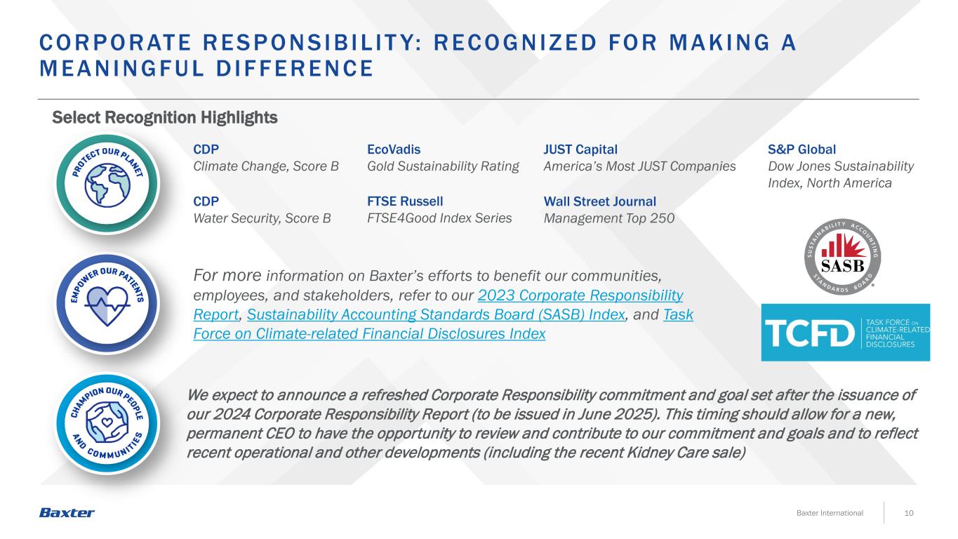 10Baxter International C O R P O R at E R ESP O NSIB IL IT Y:R EC O GNIZ ED FO R MA K in G A MEA NINGF UL D IF F ER ENC E Select Recognition Highlights有关Baxter为造福我们的社区、员工和利益相关者所做努力的更多信息,请参阅我们的2023年企业责任报告、可持续会计准则委员会(SASB)指数以及气候相关财务披露指数工作组EcoVadis Gold Sustainability Rating CDP Climate Change,score B丨CDP丨水安全,score B丨S & P Global 标普全球丨道琼斯可持续发展指数,北美华尔街日报Management Top 250 FTSE Russell FTSE4Good Index Series JUST Capital America’s Most JUST Companies We expect to announce a refreshed corporate responsibility commitment and goal set after our 2024 corporate responsibility report(将于2025年6月发布)。这个时机应该允许新的永久CEO有机会审查并为我们的承诺和目标做出贡献,并反映最近的运营和其他发展(包括最近的肾脏护理销售)