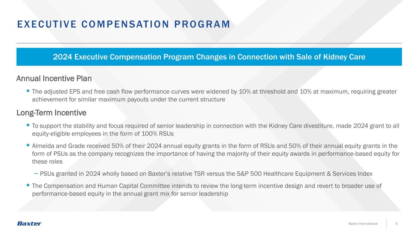 9Baxter International ECEC UT IVE C O MP ENSAT IO N P RO GR A M 2024高管薪酬计划与出售肾脏护理年度激励计划相关的变更调整后的每股收益和自由现金流绩效曲线在阈值上分别拓宽了10%和最高10%,要求在当前结构下实现类似的最高支出需要更大的成就长期激励,以支持与肾脏护理剥离相关的高级领导层所需的稳定性和专注度,将2024年以100% RSU的形式授予所有符合股权资格的员工Almeida and Grade以RSU的形式获得其2024年年度股权授予的50%,以PSU的形式获得其年度股权授予的50%,因为该公司认识到将其大部分股权奖励放在基于绩效的股权中以用于这些角色的重要性—— 2024年授予的PSU完全基于Baxter相对TSR与标普 500医疗保健设备和服务指数,薪酬和人力资本委员会打算审查长期激励设计并在高级领导层的年度赠款组合中恢复更广泛地使用基于绩效的股权