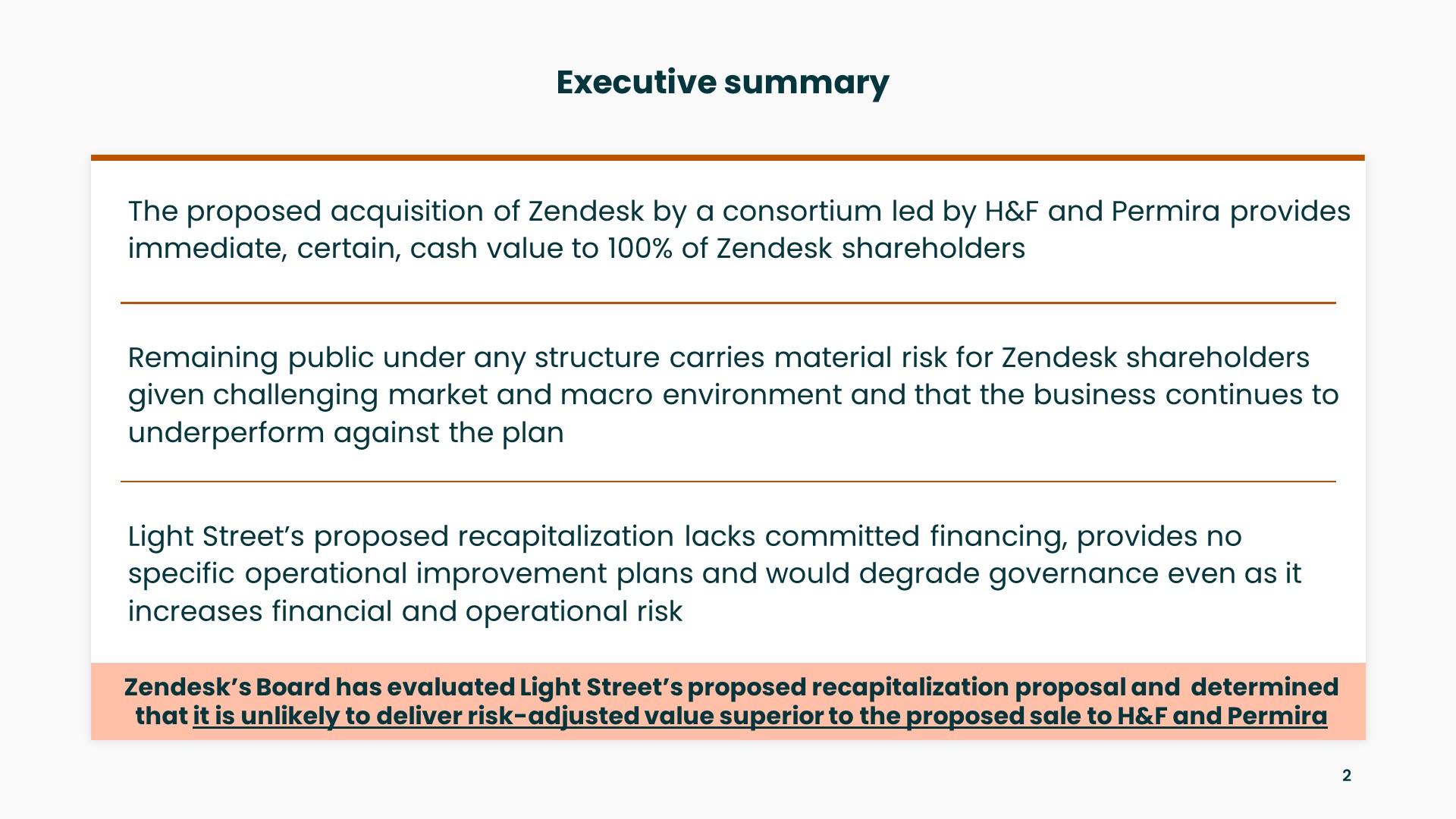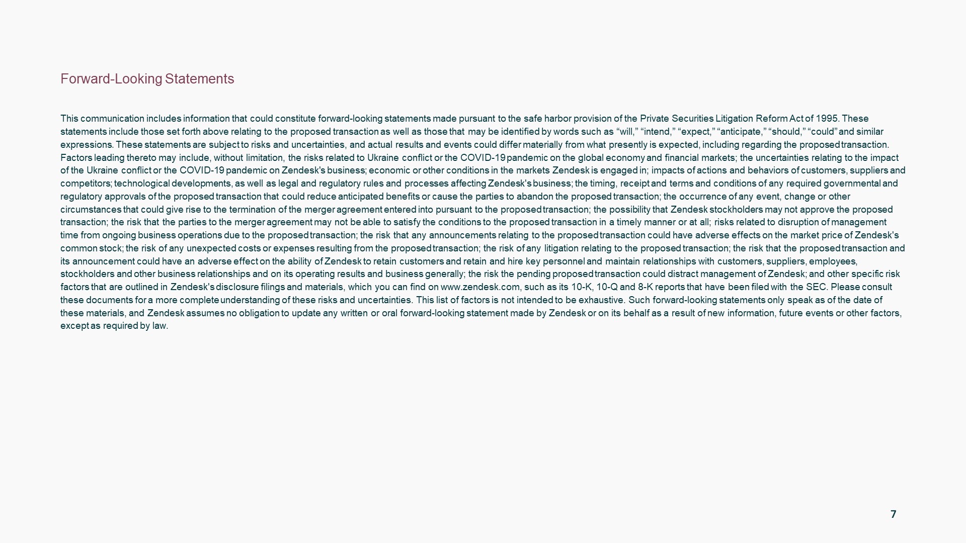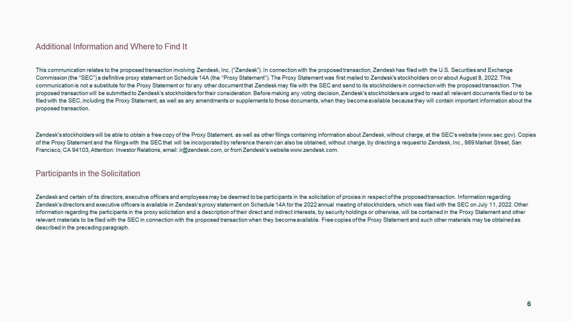 本通讯涉及涉及Zendesk, Inc.(“Zendesk”)的拟议交易。就拟议交易而言,Zendesk已向美国证券交易委员会(“SEC”)提交了附表14A的最终委托书(“委托书”)。代理声明于2022年8月8日左右首次邮寄给Zendesk的股东。本通讯不能替代代理声明或Zendesk可能向SEC提交并发送给其股东的与拟议交易有关的任何其他文件。拟议的交易将提交给Zendesk的股东以供他们考虑。在做出任何投票决定之前,我们敦促Zendesk的股东阅读所有已提交或将提交给SEC的相关文件,包括代理声明,以及对这些文件的任何修改或补充,当它们可用时,因为它们将包含 有关拟议交易的重要信息。Zendesk的股东将能够在美国证券交易委员会的网站上免费获得代理声明的副本,以及包含有关Zendesk信息的其他文件。代理声明和提交给美国证券交易委员会的文件的副本也可以通过将请求发送到加利福尼亚州,989 Market Street,San Francisco,994103,免费获得,地址:Investor Relations,email:ir@zendesk.com,或Zendesk的网站www.zendesk.com。征集Zendesk的参与者及其某些董事、执行官和员工可能被视为有关拟议交易的代理征集的参与者。有关Zendesk董事和执行官的信息,请参阅Zendesk于2022年7月11日向美国证券交易委员会提交的2022年股东年会附表14A中的代理声明。 有关代理征集参与者的其他信息以及对他们通过证券持有或其他方式的直接和间接利益的描述,将包含在代理声明和其他相关材料中,这些材料将提交给美国证券交易委员会,与拟议交易有关变得可用。可以获得前款所述的代理声明和其他材料的免费副本。6