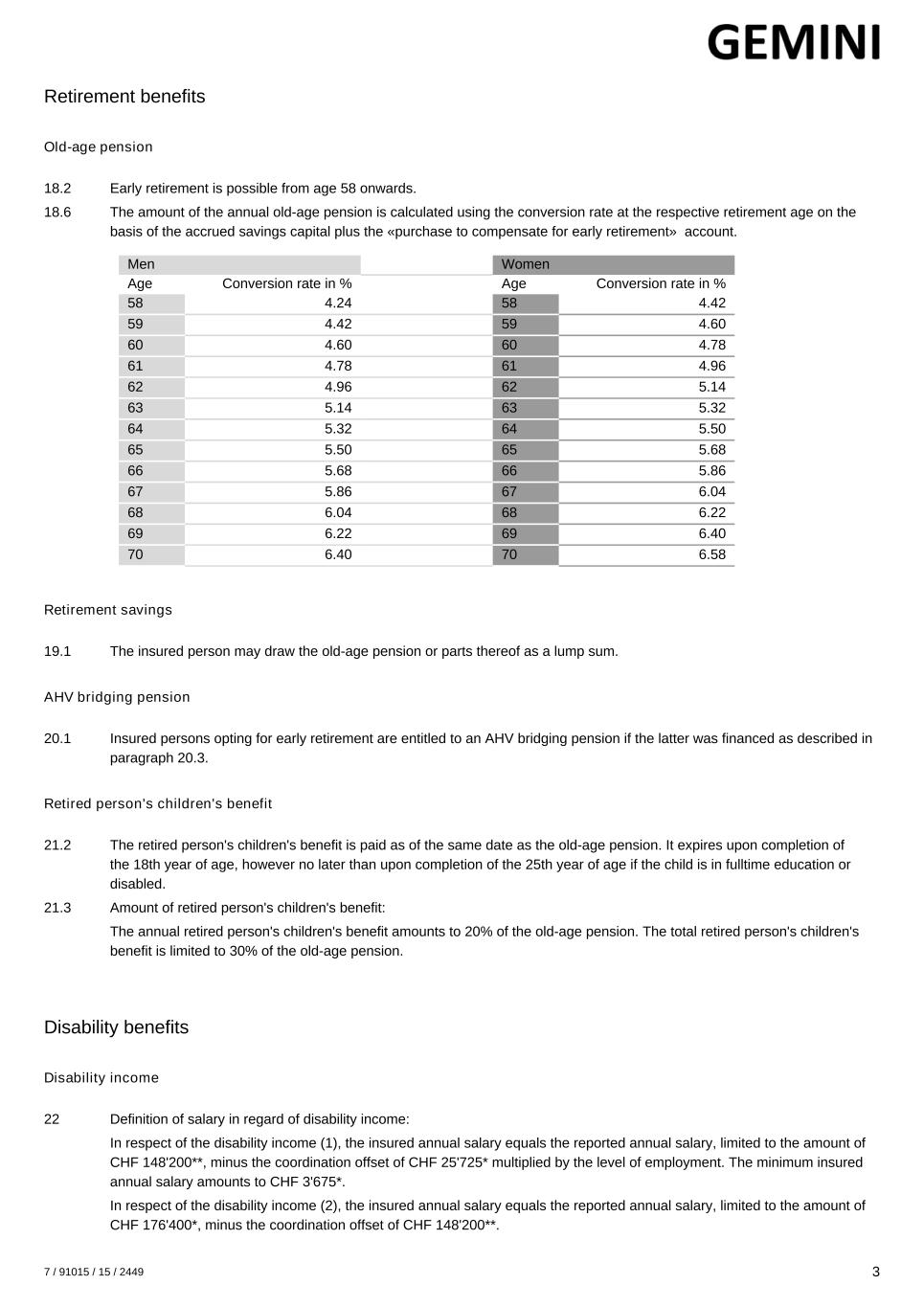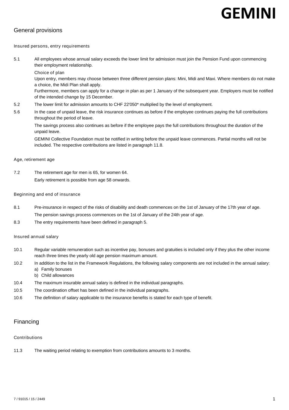 一般规定参保人、入职要求5.1凡年薪超过入职下限的职工,在开始雇佣关系时,必须加入养老基金。计划选择入职后,会员可在Mini、Midi和Maxi三种不同的养老金计划中进行选择。会员未做出选择的,适用迷笛计划。此外,成员可按下一年的1月1日申请更改计划。雇主必须在12月15日之前收到意向变更的通知。5.2入学下限为22 ' 050瑞士法郎*乘以就业水平。5.6在无薪休假的情况下,如果雇员在整个休假期间继续支付全额缴款,风险保险将一如既往。如果员工在整个无薪假期期间支付全部缴款,储蓄过程也会像以前一样继续。双子座集体基金会必须在无薪休假开始前以书面形式通知。部分月份将不包括在内。第11.8段列出了各自的贡献。年龄,退休年龄7.2男性的退休年龄为65岁,女性为64岁。58岁起可提前退休。保险开始和结束8.1关于伤残和死亡风险的预先保险从17岁的1月1日开始。养老金储蓄程序从24岁的1月1日开始。8.3第5款界定了入境要求。参保年薪10.1激励薪酬、奖金、酬金等定期浮动薪酬,在加上其他收入达到年养老金最高金额三倍的情况下,才算在内。10.2除《框架条例》中的清单外,以下工资部分不包括在年薪中:a)家庭奖金b)子女津贴10.4最高可保年薪在个别段落中定义。10.5协调抵销已在各个段落中定义。10.6每一种福利都说明了适用于保险福利的工资定义。筹资捐款11.3与豁免捐款有关的等待期达3个月。7 / 91015 / 15 / 2449 1
