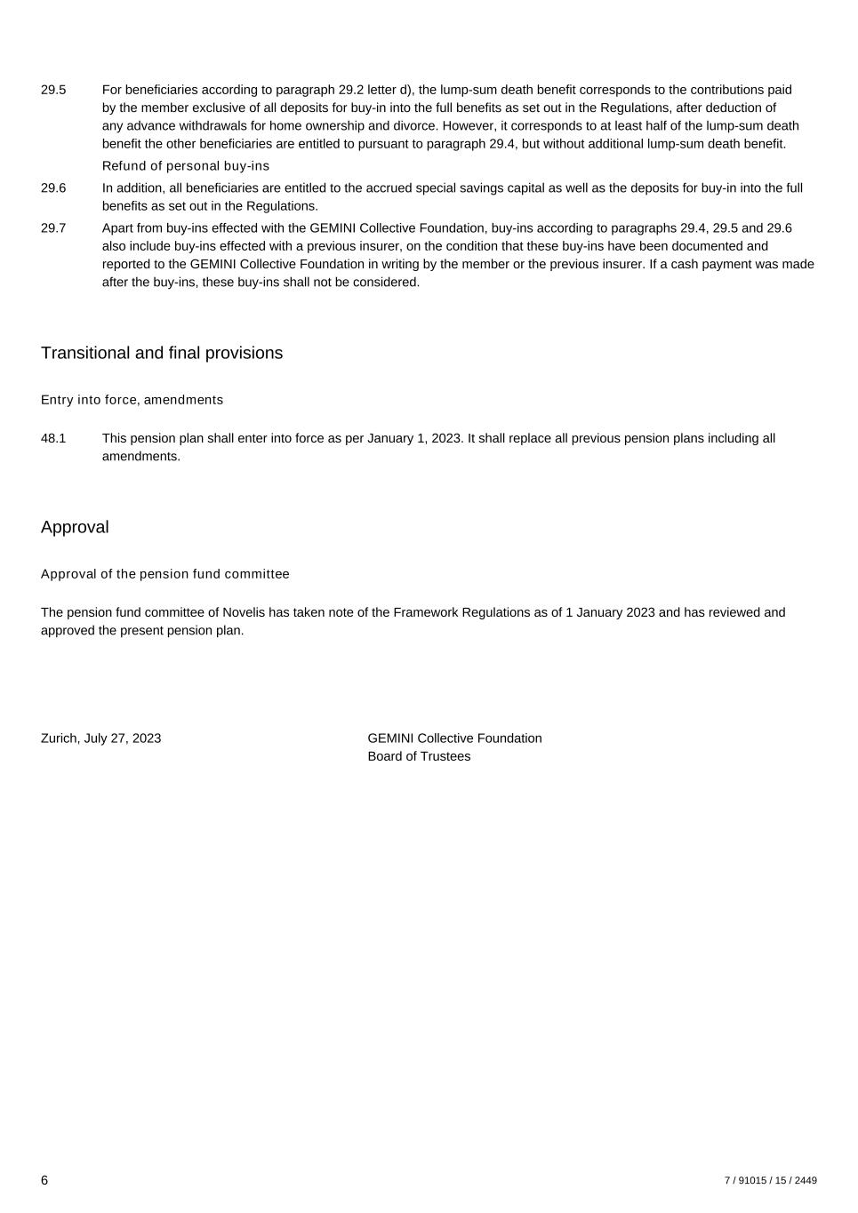 29.5对于根据第29.2款d)项规定的受益人,一次性死亡抚恤金对应的是成员支付的缴款,不包括用于买入《条例》规定的全额抚恤金的所有存款,在扣除任何提前提取的房屋所有权和离婚后。然而,它至少相当于其他受益人根据第29.4款有权获得的一次性死亡抚恤金的一半,但没有额外的一次性死亡抚恤金。退还个人买入29.6此外,所有受益人都有权获得《条例》规定的应计特别储蓄资本以及买入全额福利的存款。29.7除了与GEMINI集体基金会进行的买入外,根据第29.4、29.5和29.6段进行的买入还包括与先前的保险公司进行的买入,条件是这些买入已记录在案,并由成员或先前的保险公司以书面形式向GEMINI集体基金会报告。买入后支付现金的,不考虑这些买入。过渡性和终局条款生效,修正案48.1本养老金计划自2023年1月1日起生效。它将取代之前的所有养老金计划,包括所有修正案。批准养老基金委员会的批准诺贝丽斯养老基金委员会已注意到截至2023年1月1日的框架规定,并已审查并批准了本养老金计划。苏黎世,2023年7月27日GEMINI集体基金会董事会67/91015/15/2449