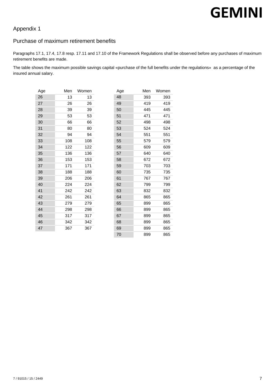 附录1购买最高退休福利第17.1、17.4、17.8段。购买最高退休福利前应遵守框架规定的17.11和17.10。该表显示了最大可能的储蓄资本“购买规定下的全部福利”,以保险年薪的百分比表示。年龄男女26131327262628393929535330666631808032949433 10810834122122351361363615315337171171381883920620640224224224412242422422614327927944298298453173174634234247367367367年龄男女483933934941941950445445514714715245455795795660960957 640 640 58 672 672 59 703 703 60 735 735 61 767 767 62 799 799 63 832 832 64 865 865 65 899 865 66 899 865 67 899 865 68 899 865 69 899 865 70 899 865 7 / 91015 / 15 / 2449 7