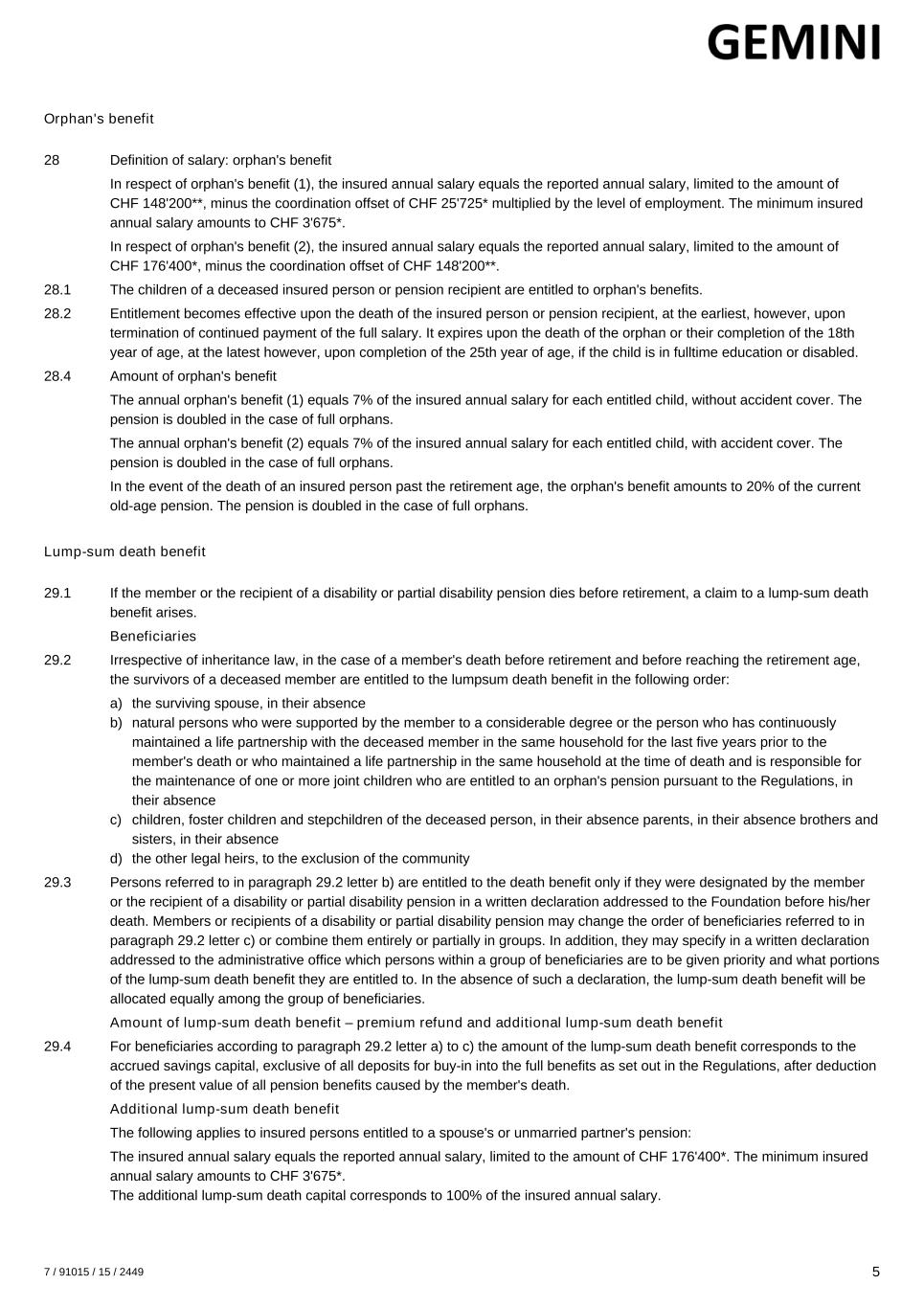 孤儿福利28工资的定义:孤儿福利方面的孤儿福利(1),投保年薪等于报告的年薪,金额限制为148‘200瑞士法郎* *,减去25’725瑞士法郎*的协调抵消乘以就业水平。最低投保年薪达3 ' 675瑞士法郎*。关于孤儿福利(2),保险年薪等于报告的年薪,金额限制为176‘400瑞士法郎*,减去148’200瑞士法郎* *的协调抵消。28.1死亡参保人或养老金领取人的子女有权享受孤儿抚恤金。28.2权利在被保险人或养老金领取人死亡时生效,但最早在终止继续支付全额工资时生效。它在孤儿死亡或其完成18岁时到期,但最迟在完成25岁时,如果儿童正在接受全日制教育或残疾。28.4孤儿抚恤金金额年度孤儿抚恤金(1)相当于每个有资格的孩子投保年薪的7%,不含意外险保障。全额孤儿的情况下,抚恤金加倍。每年孤儿抚恤金(2)相当于每个有资格的孩子的保险年薪的7%,附带意外保险。全额孤儿的情况下,抚恤金加倍。参保人超过退休年龄死亡的,孤儿抚恤金相当于当期养老金的20%。全额孤儿的情况下,抚恤金加倍。一次总付死亡抚恤金29.1如果成员或残疾或部分残疾抚恤金的领取人在退休前死亡,则产生对一次总付死亡抚恤金的索赔。受益人29.2不论继承法如何,在成员在退休前和达到退休年龄前死亡的情况下,已故成员的遗属有权按以下顺序领取一次性死亡抚恤金:a)未亡配偶,在其不在的情况下b)在成员相当程度上得到供养的自然人或在成员去世前最近五年内与去世成员在同一家庭中连续保持终身伴侣关系的人或在死亡时在同一家庭中保持终身伴侣关系并负责抚养一名或多名根据《条例》有权领取孤儿抚恤金的共同子女的人,在其不在的情况下c)死者的子女、寄养子女和继子女,在其父母不在的情况下,缺席的兄弟姐妹,缺席的d)其他法定继承人,不包括社区29.3第29.2段b)项中提及的人,只有在成员或残疾或部分残疾抚恤金的领取人在其去世前向基金会提交的书面声明中指定他们时,才有权领取死亡抚恤金。残疾或部分残疾抚恤金的成员或领取人可更改第29.2款c)项中提及的受益人顺序或将其全部或部分合并为组。此外,他们可以在发给行政办公室的书面声明中具体说明受益人群体中的哪些人将被优先考虑,以及他们有权获得一次性死亡抚恤金的哪些部分。在没有这种申报的情况下,一次性死亡抚恤金将在受益人群体中平均分配。一次总付死亡抚恤金金额–保费退款和额外一次总付死亡抚恤金29.4根据第29.2段a)至c)款受益人的一次总付死亡抚恤金金额对应于应计储蓄资本,不包括《条例》规定的用于买入全额抚恤金的所有存款,在扣除成员死亡造成的所有养老金福利的现值后。额外的一次性死亡抚恤金以下适用于有权获得配偶或未婚伴侣抚恤金的被保险人:受保年薪等于报告的年薪,金额限制为176 ' 400瑞士法郎*。最低投保年薪达3 ' 675瑞士法郎*。追加的一次性死亡资本对应100%的参保年薪。7 / 91015 / 15 / 2449 5