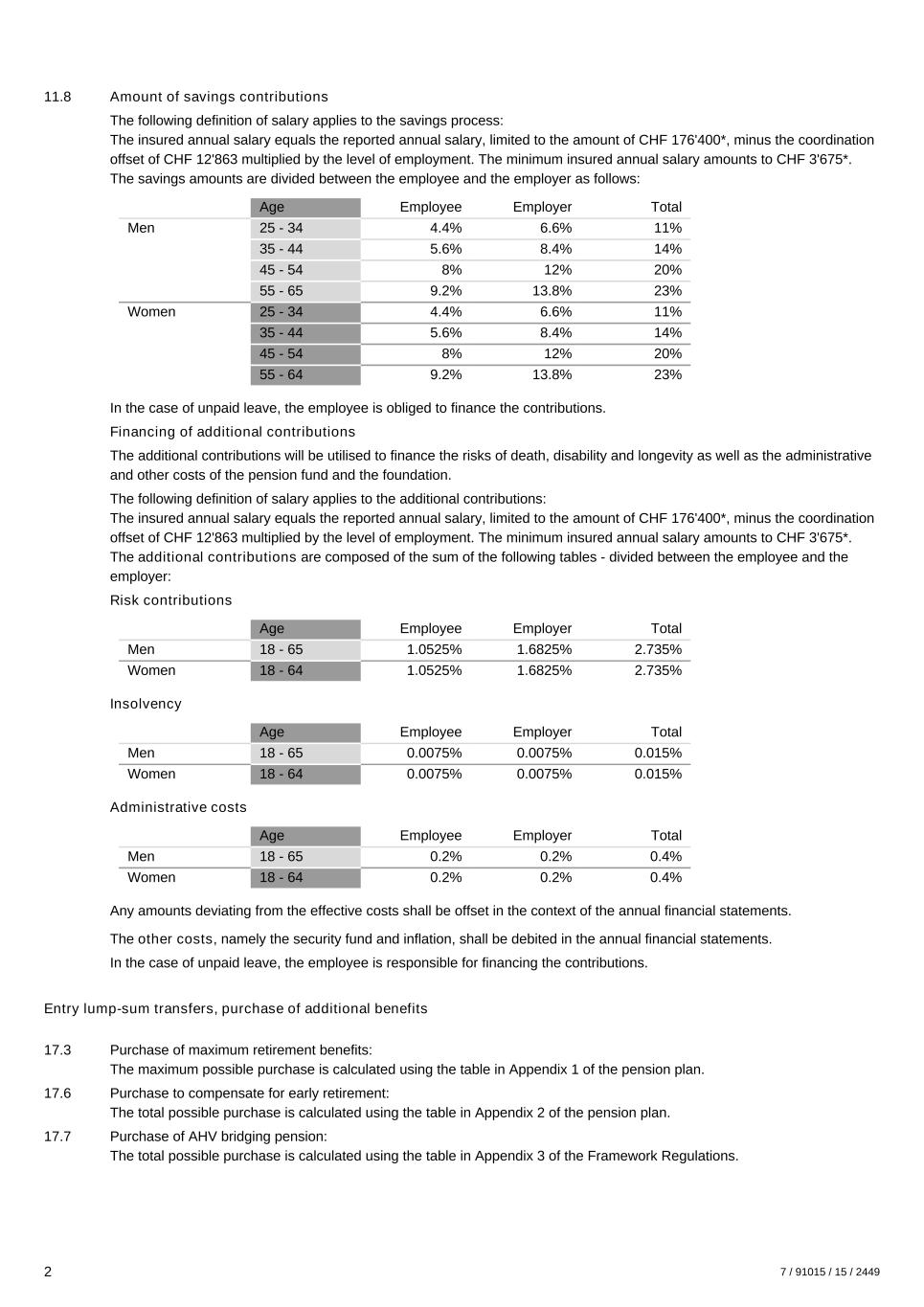 11.8储蓄缴款数额以下工资定义适用于储蓄过程:受保年薪等于报告的年薪,金额限制为176‘400瑞士法郎*,减去12’863瑞士法郎的协调抵消乘以就业水平。最低投保年薪达3 ' 675瑞士法郎*。雇员和雇主之间的储蓄金额分配如下:年龄雇员雇主合计男性25-344.4% 6.6% 11% 35-445.6% 8.4% 14% 45-548% 12% 20% 55-659.2% 13.8% 23%女性25-344.4% 6.6% 11% 35-445.6% 8.4% 14% 45-548% 12% 20% 55-649.2% 13.8% 23%在无薪假的情况下,雇员有义务为供款提供资金。额外供款的融资额外供款将用于为死亡、残疾和长寿风险以及养老基金和基金会的行政和其他费用提供资金。以下工资定义适用于额外缴款:受保年薪等于报告的年薪,金额限制为176‘400瑞士法郎*,减去12’863瑞士法郎的协调抵消乘以就业水平。最低投保年薪达3 ' 675瑞士法郎*。额外供款由以下表格之和组成-由雇员和雇主划分:风险供款年龄雇员雇主合计男性18-651.05 25% 1.68 25% 2.735%女性18-641.05 25% 1.68 25% 2.735%破产年龄雇员雇主合计男性18-650.0075% 0.0075% 0.015%女性18-640.0075% 0.0075% 0.015%行政费用年龄雇员雇主合计男性18-650.2% 0.4%女性18-640.2% 0.2% 0.4%任何偏离有效成本的金额应在年度财务报表中予以抵销。其他费用,即保证金和通货膨胀,应在年度财务报表中借记。在无薪休假的情况下,雇员负责为捐款提供资金。入职整笔转账,购买额外福利17.3购买最高退休福利:使用养老金计划附录1中的表格计算可能购买的最高金额。17.6购买补偿提前退休:使用养老金计划附录2中的表格计算可能的购买总额。17.7购买AHV过渡性养老金:可能购买总额使用框架规定附录3表格计算。2 7 / 91015 / 15 / 2449