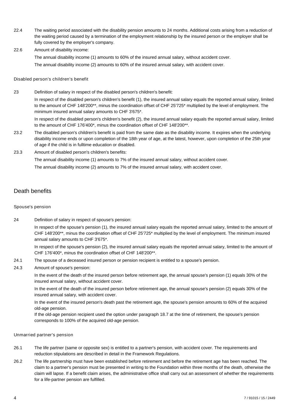 22.4与伤残抚恤金相关的等待期达24个月。因投保人或用人单位解除雇佣关系导致的等待期缩短而产生的额外费用,由用人单位全额承担。22.6伤残收入金额:年伤残收入(1)金额为参保年薪的60%,不含意外险保障。年伤残收入(2)相当于保险年薪的60%,附意外险保障。残疾人子女福利金23关于残疾人子女福利金的工资定义:就残疾人子女福利金(1)而言,保险年薪等于报告的年薪,金额限制为148‘200瑞士法郎* *,减去25’725瑞士法郎*的协调抵消乘以就业水平。最低投保年薪达3 ' 675瑞士法郎*。就残疾人子女福利(2)而言,保险年薪等于报告的年薪,金额限制为176‘400瑞士法郎*,减去148’200瑞士法郎* *的协调抵消。23.2残疾人子女抚恤金与伤残收入同日起支付。它在基础残疾收入结束时或在完成18岁时到期,但如果儿童正在接受全日制教育或残疾,则最迟在完成25岁时到期。23.3残疾人子女抚恤金金额:年伤残收入(一)达参保年薪的7%,不含意外险保障。年伤残收入(2)相当于保险年薪的7%,附意外险保障。死亡抚恤金配偶抚恤金24关于配偶抚恤金的工资定义:就配偶抚恤金(1)而言,保险年薪等于报告的年薪,金额限制为148‘200瑞士法郎* *,减去25’725瑞士法郎*的协调抵消乘以就业水平。最低投保年薪达3 ' 675瑞士法郎*。关于配偶的养老金(2),保险年薪等于报告的年薪,金额限制为176‘400瑞士法郎*,减去148’200瑞士法郎* *的协调抵消。24.1已死亡的被保险人或养老金领取人的配偶有权领取配偶养老金。24.3配偶抚恤金数额:参保人在退休年龄前死亡的,配偶年抚恤金(一)等于参保年薪的30%,不含意外险。参保人在退休年龄前死亡的,配偶年抚恤金(二)等于参保年薪的30%,附意外险保障。参保人超过退休年龄死亡的,配偶抚恤金金额为后天养老金的60%。养老金领取人在退休时使用第18.7款选择权的,配偶的养老金对应于既得养老金的100%。未婚伴侣抚恤金26.1终身伴侣(同性或异性)有权领取伴侣抚恤金,附意外险。要求和减持规定在《框架规定》中有详细说明。26.2终身伴侣关系必须是在退休前和达到退休年龄之前建立的。对伴侣养老金的索赔必须在死亡后三个月内以书面形式向基金会提出,否则索赔将失效。发生利益诉求的,行政办公室应当开展是否满足终身伴侣养老金要求的评估。4 7 / 91015 / 15 / 2449