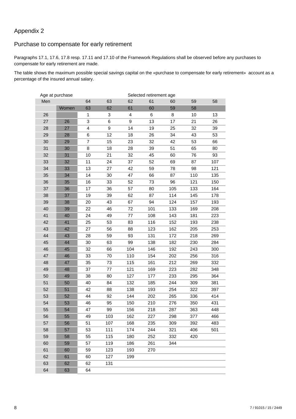 附录2购买补偿提前退休第17.1、17.6、17.8段respp。框架规定的17.11和17.10在进行任何补偿提前退休的购买前应遵守。该表显示了“购买补偿提前退休”账户上可能的最大专项储蓄资本占参保年薪的比例。购买年龄选定退休年龄男性64636261605958女性6362616059582613468 1013272636913172126282749141925323929286121826344353302971523324253663130818283951658032311021324560769333321124375269871073433132742597898 121 35 34 14 30 47 66 87 110 135 36 35 16 33 52 73 96 121 150 37 36 17 36 57 80 105 133 164 38 37 19 39 62 87 114 145 178 39 38 20 43 67 94 124 157 193 40 39 22 46 72 101 133 169 208 41 40 24 49 77 108 143 181 223 42 41 25 53 83 116 152 193 238 43 42 27 56 88 123 162 205 253 44 43 28 59 93 131 172 218 269 45 44 30 63 99 138 182230 284 46 45 32 66 104 146 192 243 300 47 46 33 70 110 154 202 256 316 48 47 35 73 115 161 212 269 332 49 48 37 77 121 169 223 282 348 50 49 38 80 127 177 233 295 364 51 50 40 84 132 185 244 309 381 52 51 42 88 138 193 254 322 397 53 52 44 92 144 202 265 336 414 54 53 46 95 150 210 276 350 431 55 54 47 99 156 218 287 363 448 56 55 49 103 162 227 298377 466 57 56 51 107 168 235 309 392 483 58 57 53 111 174 244 321 406 501 59 58 55 115 180 252 332 420 60 59 57 119 186 261 344 61 60 59 123 193 270 62 61 60 127 199 63 62 62 131 64 63 64 8 7 / 91015 / 15 / 2449