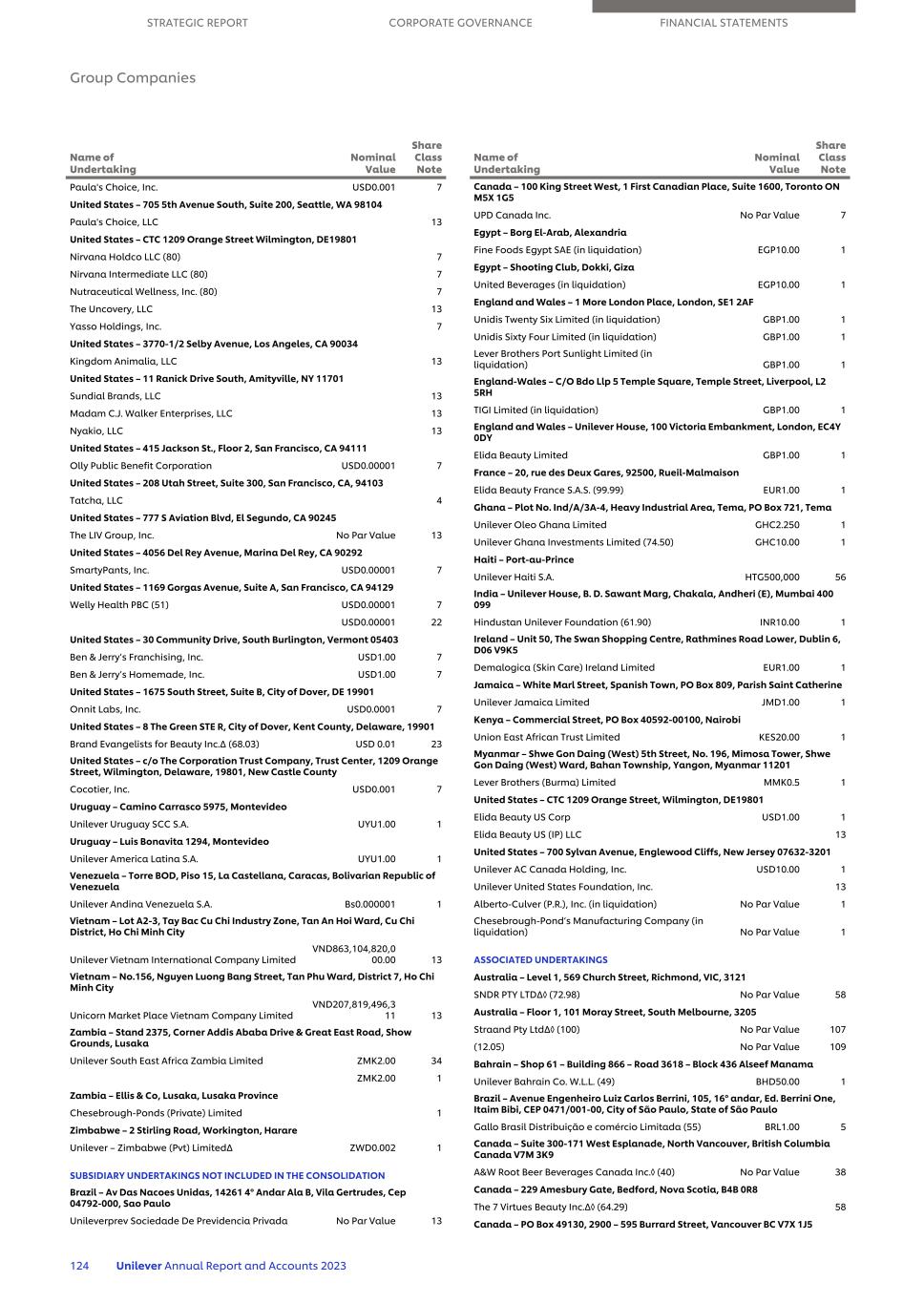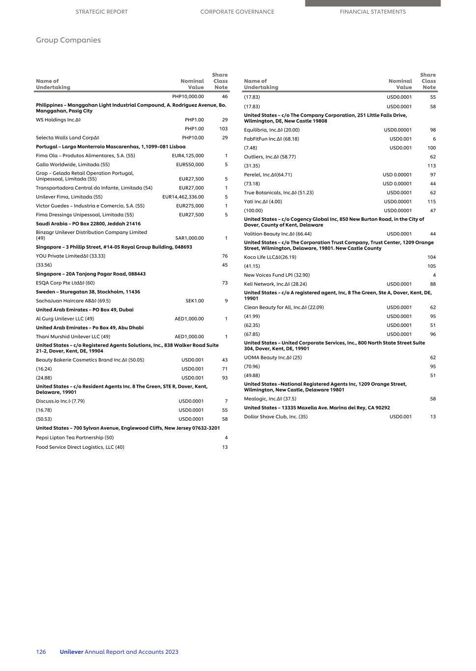 PHP10,000.00 46 Philippines – Manggahan Light Industrial Compound,A.Rodriguez Avenue,Bo。Manggahan,Pasig City WS Holdings Inc.丨⑤ PHP1.00 29 PHP1.00 103 Selecta Walls Land Corp丨⑤ PHP10.00 29 Portugal – Largo Monterroio Mascarenhas,1,1099 – 081 Lisboa Fima Ola – Produtos Alimentares,S.A.(55)EUR4,125,000 1 Gallo Worldwide,Limitada(55)EUR550,0005 Grop – Gelado Retail Operation Portugal,Unipessoal,Limitada(55)EUR27,500 5 Transportadora Central do Infante,Limitada(54)EUR27,000 1 联合利华 Fima,Limitada(55)EUR14,462,336.00 5 Victor Guedes –Jeddah 21416 Binzagr 联合利华 Distribution Company Limited(49)SAR1,000.00 1 Singapore – 3 Phillip Street,# 14-05 Royal Group Building,048693 YOU Private Limited丨⑤(33.33)76(33.56)45 Singapore – 20A Tanjong Pagar Road,088443 ESQA Corp Pte Ltd丨⑤(60)73 Sweden – StudeGatan 38,Stockholm,11436 SachaJuan Haircare AB丨⑤(69.5)SEK1.00 9 Arab United Emirates – PO Box 49,Dubai Al Gurg 丨联合利华 LLC(49)AED1,000.00 1 Arab United Emirates – PO Box 49,Abu Dhabi Thani Murshid 联合利华19904年Beauty Bakerie Cosmetics Brand Inc.丨⑤(50.05)USD0.00143(16.24)USD0.00171(24.88)USD0.001 93美国– c/o Resident Agents Inc. 8 The Green,STE R,都福,Kent,Delaware,19901 Discuss.io Inc. ⑤(7.79)USD0.00017(16.78)USD0.0001 55(50.53)USD0.0001 58美国– 700 Sylvan Avenue,Englewood Cliffs,New Jersey 07632-3201 Pepsi Lipton Tea Partnership(50)4 Food Service Direct Logistics,LLC(40)13 Name of Unitering Nominal Value Share Class Note(17.83)USD0.0001 55(Inc.丨⑤(20.00)USD0.00001 98 FABFITFUN Inc.丨丨(68.18)USD0.001 6(7.48)USD0.001 100 Outliers,Inc.丨丨丨(58.77)62(31.35)113 Perelel,Inc.丨丨(64.71)USD 0.0000197(73.18)USD 0.0000144 True Botanicals,Inc.丨丨(51.23)USD0.0001 62 Yati Inc.丨丨(4.00)USD0.00001 115(100.00)USD0.00001 47美国– c/o Cogency Global Inc,850 New Burton Road,in the city of Kent,County of Kent,Delaware Volition Beauty Inc.丨⑤(66.44)USD0.0001 44美国– c/o TheNew Castle County Koco Life LLC 00291(26.19)104(41.15)105 New Voices Fund LP ⑤(32.90)4 Keli Network,Inc.丨⑤(28.24)USD0.0001 88美国– c/o A registered agent,Inc,8 the Green,Ste A,都福,Kent,DE,19901 Clean Beauty for All,Inc. 00291(22.09)USD0.0001 62(41.99)USD0.0001 95(62.35)USD0.0001 51(67.85)USD0.0001 96美国– United Corporate Services,Inc.,800 North丨State Street丨Suite 304,都福,Kent,DE,19901 UOMA Beauty Inc.丨⑤(25)62(70.96)95(49.88)51Inc.丨⑤(37.5)58美国– 13335 Maxella Ave. Marina del Rey,加利福尼亚州 90292美元Shave Club,Inc.(35)USD0.001 13承担名义价值股份类别票据战略报告公司治理财务报表集团公司126丨联合利华联合利华 2023年年度报告和决算