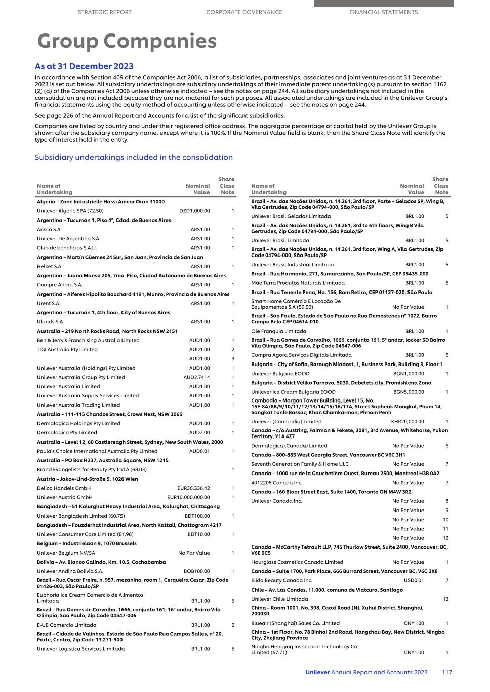 截至2023年12月31日,根据《2006年公司法》第409条,截至2023年12月31日的子公司、合伙企业、联营企业和合营企业名单如下。根据2006年《公司法》第1162(2)(a)条,所有附属企业均为其直接母企业的附属企业,除非另有说明——见第244页的注释。不包括在合并范围内的所有附属企业不包括在内,因为它们对这些目的而言并不重要。除非另有说明,否则所有关联企业均采用权益法核算纳入联合利华集团的财务报表——见第244页附注。重要子公司名单见年报及账目第226页。公司按国家和注册办公地址列出。联合利华集团持有的资本的合计百分比显示在子公司名称之后,除非该百分比为100%。如果名义价值字段为空白,则股份类别票据将识别在实体中持有的权益类型。纳入合并范围的子公司阿尔及利亚– Zone Industrielle Hassi Ameur Oran 31000 联合利华 Alg é rie SPA(72.50)DZD1,000.00 1 Argentina – Tucum á n 1,Piso 4 °,CDAD. de Buenos Aires Arisco S.A. ARS1.00 1丨联合利华联合利华 de Argentina S.A. ARS1.00 1 Club de beneficios S.A.U. ARS1.00 1 Argentina – Mart í n Martín G ü emes 24 Sur,San Juan,Provincia de San Juan Helket S.A. ARS1.00 1 Argentina – Juana Manso 205,7mo。Piso,Ciudad Aut ó noma de Buenos Aires Compre Ahora S.A. ARS1.00 1 Argentina – Alferez Hipolito Bouchard 4191,Munro,Provincia de Buenos Aires Urent S.A. ARS1.00 1 Argentina – Tucum á n 1,4th floor,City of Buenos Aires Ulands S.A. ARS1.00 1 Australia – 219 North Rocks Road,North Rocks NSW 2151 Ben & Jerry‘s Franchising Australia Limited AUD1.00 1 TIGI Australia Pty Limited AUD1.00 2 AUD1.00 3 联合利华 Australia(Holdings)Pty Limited AUD1.00 1丨丨Unilever 联合利华 Australia Group Pty Limited AUD2.7414 1 联合利华丨澳供服务有限公司AUD1.00 1 联合利华TERM4丨澳大利亚贸易有限公司AUD1.00 1澳大利亚– 111-115 Chandos Street,Crows Nest,NSW 2065 Dermalogica Holdings Pty Limited AUD1.00 1 Dermalogica Pty Limited AUD2.00 1澳大利亚– Level 12,60 CastlereAgh Street,Sydney,New South Wales,2000 Paula’s Choice International Australia Pty Limited AUD0.01 1澳大利亚– PO BoxNSW 1215 Brand Evangelists for Beauty Pty Ltd ↓(68.03)1 Austria – Jakov-Lind-Stra ß e 5,1020 Wien Delico Handels GmbH 36,336.42 1 联合利华 Austria GmbH 10,000,000.00欧元1 Bangladesh – 51 Kalurghat Heavy Industrial Area,Kalurghat,Chittagong丨联合利华丨孟加拉国有限公司(60.75)BDT100.00 1 Bangladesh – Fouzderhat Industrial Area,North Kattali,Chattogram 4217丨联合利华联合利华 Consumer Care Limited(81.98)BDT10.00 1 Belgium – Industrielaan 9,1070 Brussels 联合利华 Belgium NV/SA No P布兰科·加林多,公里。10.5、Cochabamba 联合利华 Andina Bolivia S.A. BOB100.00 1 Brazil – Rua Oscar Freire,n.957,mezanino,room 1,Cerqueira Cesar,Zip Code 01426-003,S ã o Paulo/SP Euphoria Ice Cream Comercio de Alimentos Limitada BRL1.00 5 Brazil – Rua Gomes de Carvalho,1666,conjunto 161,16th andar,Bairro Vila Olimpia,S ã o Paulo,Zip Code 04547-006 E-UB Com é rcio Limitada BRL1.00 5 Brazil – cidade de Valinhos,Estado de S ã o Paulo Rua Campos Sallesn. 14.261,3rd floor,Parte – Gelados SP,Wing B,Vila Gertrudes,Zip Code 04794-000,S ã o Paulo/SP 联合利华 Brasil Gelados Limitada BRL1.00 5 Brazil – AV. das Na çõ es Unidas,n. 14.261,3rd to 6th floor,Wing B Vila Gertrudes,Zip Code 04794-000,S ã o Paulo/SP丨Unilever 丨联合利华 Brasil Limitada BRL1.00 5 Brazil – AV. das Na çõ es Unidas,n. 14.261,3rd floor,Wing A,Vila Gertrudes,Zip Code 04794-000,S ã o Paulo/SP丨Bom Retiro,CEP 01127-020,S ã o Paulo Smart Home Com é rcio e Loca çã o de Equipamentos S.A(59.50)No Par Value 1 Brazil – S ã o Paulo,Estado de S ã o Paulo na Rua Dem ó stenes n º 1072,Bairro Campo Belo CEP 04614-010 Ole Franquia Limitada BRL1.00 1 Brazil – Rua Gomes de Carvalho,1666,conjunto 161,5 standar,locker 5D Bairro Vila Olimpia,S ã o Paulo,Zip Code 04547-006 Compra Agora Servi ç os Digitais Limitada BRL1.00 5 Bulgaria – City of SofPromishlena Zona 联合利华冰淇淋保加利亚EOOD BGN5,000.00 1 Cambodia – Morgan Tower Building,Level 15,No. 15F-8A/8B/9/10/11/12/12/13/14/15/16/17A,Street Sopheak Mongkul, Phum 14,Sangkat Tonle Bassac,Khan Chamkarmon,金边联合利华(柬埔寨)有限公司KHR20,000.00 1 Canada – c/o Austring,Fairman & Fekete,3081,3rd Avenue,Whitehorse,Yukon Territory,Y1A 4Z7 Dermalogica(Canada)Limited No Par Value 6 Canada – 800-885 West Georgia Street,Vancouver BC V6C 3H1 Seventh Generation Family & Home ULC No Par Value 7 Canada – 1000 rue de la Gaucheti è re Ouest,Bureau 2500,Montreal H3B 0A2 4012208 Canada Inc. No Par Value 7 Canada – 160 Bloor Street East,SuToronto on M4W 3R2 联合利华 Canada Inc. No par value 8 no par value 9 no par value 10 no par value 11 no par value 12 Canada – McCarthy Tetrault LLP,745 Thurlow Street,Suite 2400,Vancouver,BC,V6E 0C5 Hourglass Cosmetics Canada Limited no par value 1 Canada – Suite 1700,Park Place,666 Burrard Street,Vancouver BC,V6C 2X8 Elida Beauty Canada Inc. USD0.01 7 Chile – AV。Las Condes,11.000,comuna de Viatcura,Santiago 联合利华 Chile Limitada 13 China – Room 1001,No. 398,Caoxi Road(N),Xuhui District,Shanghai,200030 Blueair(Shanghai)Sales Co. Limited CNY1.00 1 China – 1st Floor,No. 78,Jingbo Hengjing Inspection Technology Co.,Ltd.,Ltd.(67.71)CNY1.00 1 Name of undertaking nominal value share class note strategic report corporate governance financial statements group companies丨Unilever 丨联合利华 2023年年度报告和账目117