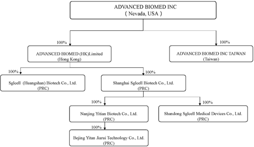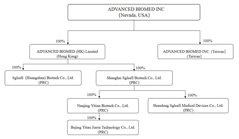 Advanced Biomed Inc.(简称“Advanced Biomed”)不是一家运营公司,而是一家在内华达州注册成立的控股公司。基本上所有的业务都是由我们的台湾子公司在台湾进行,由我们的中国子公司在中华人民共和国(“中国”或“中国”)进行。在此次发行中发行的普通股是一家美国控股公司的股票,该公司不经营业务。在本招股说明书中,“我们”、“我们”、“我们的”或“本公司”指的是美国控股公司Advanced Biomed。虽然我们的中国子公司都没有可变利益实体(“VIE”)结构,但中国监管当局可能不允许我们目前的运营结构,这可能会导致我们的运营发生重大变化和/或我们登记出售的证券的价值发生重大变化,包括可能导致此类证券的价值大幅下降或变得一文不值。请参阅“风险因素——中国政府的政策、法规、规则和法律执行的变化可能很快发生,几乎不会提前通知,可能会对我们在中国的盈利能力产生重大影响。”和“风险因素——中国政府可能随时干预或影响我们在中国的业务,或可能对海外发行和/或对中国发行人的外国投资施加更多控制,这可能导致我们的业务和/或我们登记出售的证券的价值发生重大变化。”