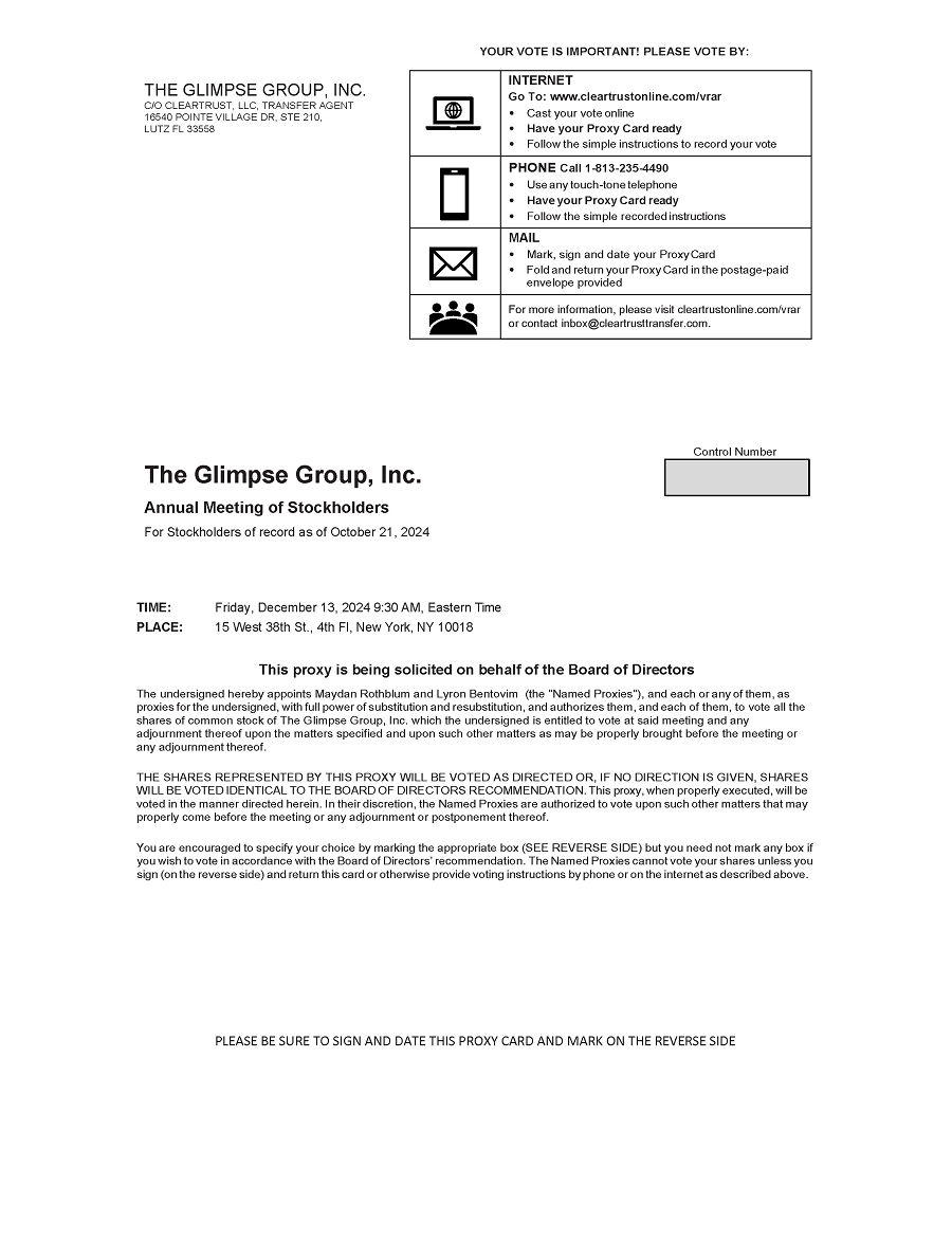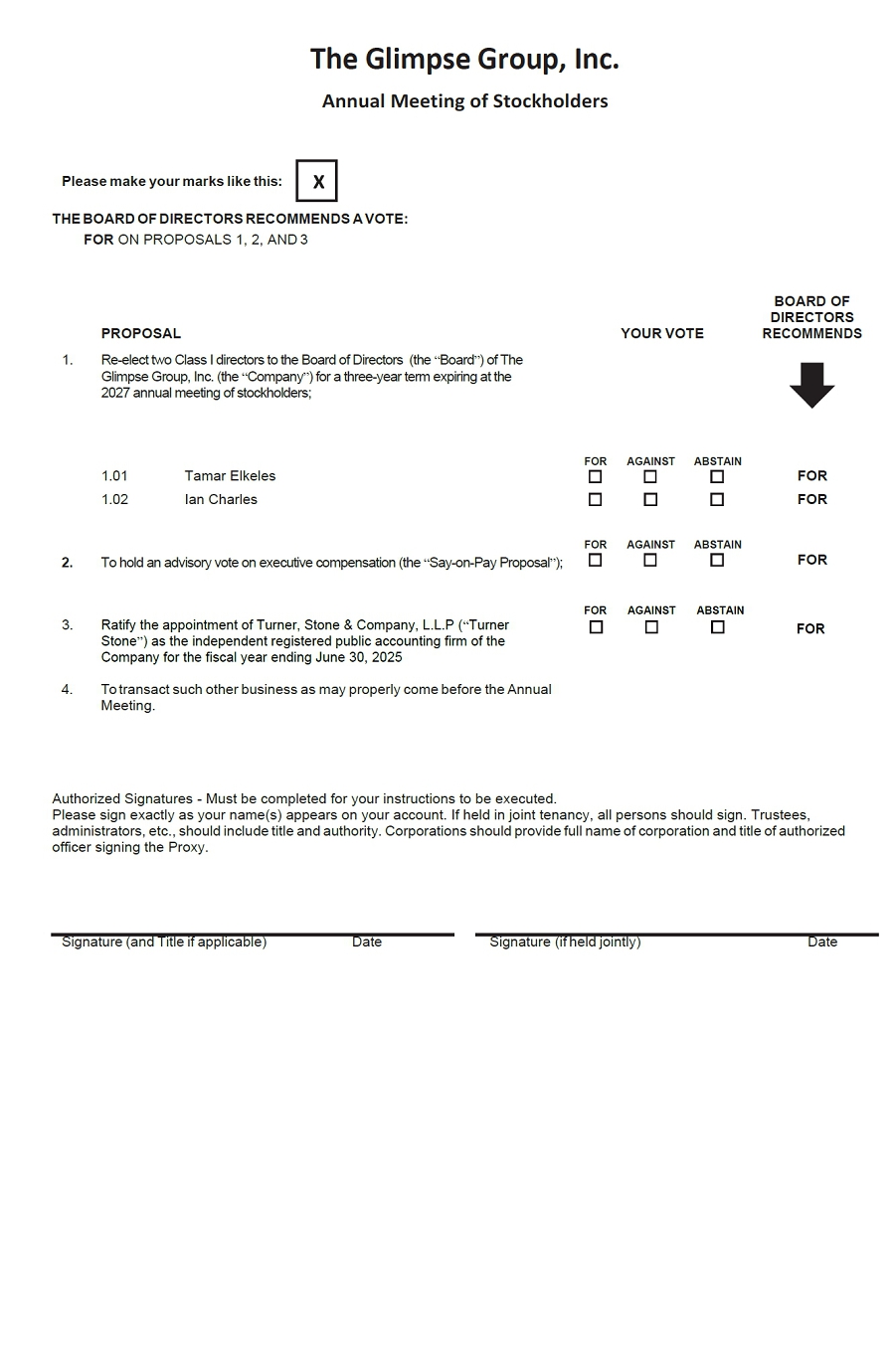 | 1. | 重新选举两名I类董事进入The Glimpse Group, Inc.(“公司”)董事会(“董事会”),任期三年,于2027年年度股东大会上届满; | |
