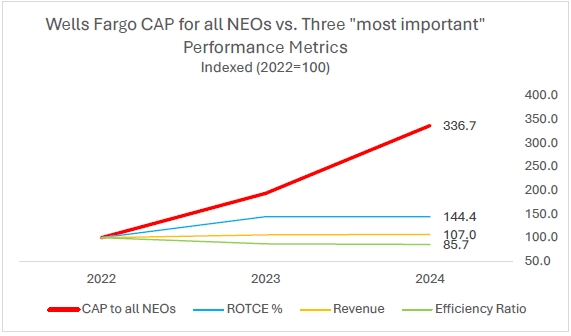 尽管富国银行在有形普通股本回报率(ROTCE)、总收入和效率比率方面的表现停滞不前,但仍支付了这些大幅加薪,人权委员会将其描述为“公司用来将实际支付给公司NEO的高管薪酬挂钩的最重要的财务业绩衡量标准”。3下图1说明了大幅加薪与业绩持平之间的脱节,尤其是在2024年。