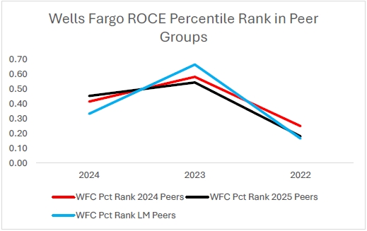 富国银行 2024年的ROCE确实略高于2024年和2025年同行的平均水平,但是,如图3所示,富国银行在这三年中的百分位排名似乎明显远低于55第2024年同行的百分位。我们计算了每个同行群体的整体平均百分位排名,发现富国银行位于第42nd2024年财务业绩同行的百分位,以及39第2025年财务业绩同行和劳动力市场同行的百分位。我们担心,人权委员会所依赖的特定措施和调整可能会过度拉平富国银行相对于同行的业绩,这导致了2024年薪酬和业绩的显着错位。