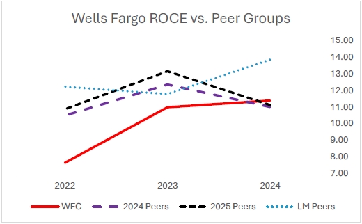 然而,正如人权委员会承认的那样,ROTCE是一种非公认会计原则的衡量标准,不同的公司可能会以不同的方式计算,甚至在考虑富国银行所做的调整之前就已经如此。10由于人权委员会不提供其自己对同行ROTCE的计算,我们转而依赖更容易获得的衡量标准——普通股本回报率(ROCE)。此外,由于富国银行在今年的代理中列出了三个同业组,我们将劳动力市场同行和2025年财务表现同行的结果包括在下图2 & 3中: