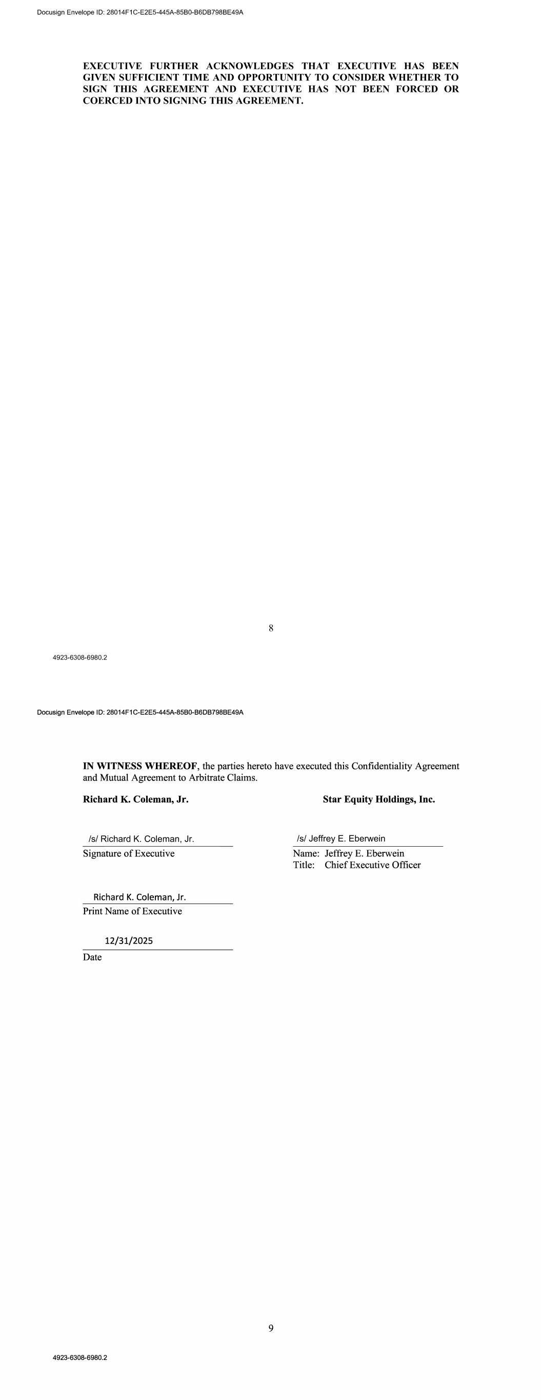 Docusign信封ID:28014F1 C-E2E5-445A-85B0-B6DB798BE49A作为证人,本合同双方已签署本保密协议和相互协议以仲裁索赔。Richard K. Coleman, Jr.执行官签名Richard K. Coleman, Jr.TERM4/s/Jeffrey E. EberweinTERM5执行人员姓名12/31/2025日期4923-6308-6980.29 Star Equity Holdings, Inc.名称:Jeffrey E. Eberwein职称:首席执行官/s/TERM4/s/TERM5