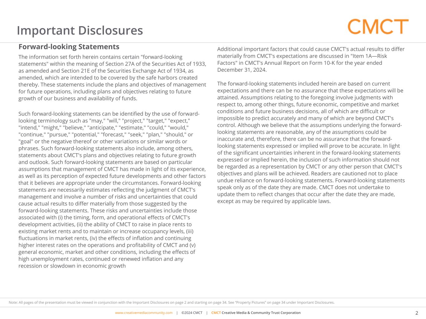www.cimgroup.com |©2018年CIM集团|贸易秘密/机密信息www.creativemediacommunity.com |©2024 CMCT Q2 2注意:演示文稿的所有页面必须与第2页和从第34页开始的重要披露内容一起查看。请参阅第34页重要披露下的“物业图片”。重要披露可能导致CMCT的实际结果与CMCT的预期存在重大差异的其他重要因素在CMCT截至2024年12月31日止年度的10-K表格年度报告中的“第1A项——风险因素”中进行了讨论。本文中包含的前瞻性陈述是基于当前的预期,无法保证这些预期将会实现。与上述有关的假设涉及对(其中包括)未来经济、竞争和市场状况以及未来业务决策的判断,所有这些都难以或不可能准确预测,其中许多超出了CMCT的控制范围。尽管我们认为前瞻性陈述背后的假设是合理的,但任何假设都可能不准确,因此,无法保证明示或暗示的前瞻性陈述将被证明是准确的。鉴于此处明或暗示的前瞻性陈述中固有的重大不确定性,包含此类信息不应被视为CMCT或任何其他人对CMCT的目标和计划将会实现的陈述。告诫读者不要过分依赖前瞻性陈述。前瞻性陈述仅在作出之日起生效。CMCT不承诺对其进行更新以反映在做出这些更改之日之后发生的更改,除非适用法律可能要求。前瞻性陈述本文中列出的信息包含经修订的1933年《证券法》第27A条和经修订的1934年《证券交易法》第21E条含义内的某些“前瞻性陈述”,这些陈述旨在涵盖在由此创建的安全港范围内。这些声明包括管理层对未来运营的计划和目标,包括与我们业务的未来增长和资金可用性相关的计划和目标。此类前瞻性陈述可以通过使用前瞻性术语来识别,例如“可能”、“将”、“项目”、“目标”、“预期”、“打算”、“可能”、“相信”、“预期”、“估计”、“可能”、“将”、“继续”、“追求”、“潜力”、“预测”、“寻求”、“计划”、“应该”或“目标”或其否定或其他变体或类似词语或短语。除其他外,此类前瞻性陈述还包括有关CMCT与未来增长和前景相关的计划和目标的陈述。此类前瞻性陈述基于CMCT管理层根据其经验作出的特定假设,以及其对预期未来发展的看法以及其认为在该情况下适当的其他因素。前瞻性陈述必然是反映CMCT管理层判断的估计,涉及许多风险和不确定性,可能导致实际结果与前瞻性陈述所暗示的结果存在重大差异。这些风险和不确定因素包括与(i)CMCT开发活动的时间、形式和运营影响,(ii)CMCT将到位租金提高至现有市场租金以及维持或增加入住率水平的能力,(iii)市场租金波动,(iv)通货膨胀和持续较高利率对CMCT的运营和盈利能力的影响,以及(v)一般经济、市场和其他条件相关的风险和不确定因素,包括高失业率、持续或再度出现的通货膨胀以及经济增长出现任何衰退或放缓的影响