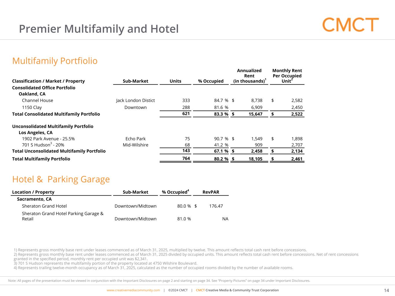 www.cimgroup.com |©2018年CIM集团|贸易机密/机密信息www.creativemediacommunity.com |©2024 CMCT | CMCTCreative Media & Community Trust Corporation 13注意:演示文稿的所有页面必须与第2页和从第34页开始的重要披露信息一起查看。请参阅第34页重要披露下的“物业图片”。Class A & Creative Office Portfolio1 Classification/Market/Address Sub-Market Class2 Rentable Square Feet(“SF”)% Occupied % Lease Annualized Rent per Occupied SF 3 Consolidated Office Portfolio Oakland,加利福尼亚州 1 Kaiser Plaza Lake Merritt Class A 537,33955.0% 55.0% $ 56.80 San Francisco,加利福尼亚州 1130 Howard Street South of Market Creative 21,19461.1% 61.1% 93.56 Los Angeles,加利福尼亚州 11620 Wilshire Boulevard West Los Angeles Class A 196,92879.0% 81.6% 49.779460 Wilshire Boulevard Beverly Hills Class A 97,65591.6% 91.6% 122.42 11600 Wilshire Boulevard West Los Angeles Class A 56,88173.4% 77.1% 63.568944 Lindblade Street**West Los Angeles Creative 7,980100.0% 100.0% 69.338960 & 8966 Washington Boulevard**West Los Angeles Creative 24,448100.0% 100.0% 78.95 1037 North Sycamore Avenue Hollywood Creative 5,031100.0% 100.0% 67.98 Austin,TX 3601 S Congress Avenue South Creative 231,24078.1% 80.2% 48.76 1021 E 7th Street East Creative 11,180100.0% 100.0% 49.91 1007 E 7th Street East Creative 1,352 —% —% 0.00合并办公组合总额1,191,22869.2% 70.2% $ 62.33未合并办公组合洛杉矶,加利福尼亚州 1910 Sunset Boulevard-44%**Echo Park Creative 107,52481.6% 84.3% 50.16未合并办公组合总额107,52481.6% 84.3% $ 50.16办公组合总额1,298,75270.2% 71.4% $ 61.1451% 30% 17% 2%洛杉矶奥克兰奥斯汀旧金山1)截至2025年3月31日。2)这些描述是基于管理层的评估,并表明我们的分类为“甲级办公室”或“创意办公室”建筑。3)表示每月基本租金毛额,或停车场和零售租赁项下的每月合同租金毛额,乘以12。这一数额反映了减征前的现金租金总额。在适用的情况下,年化租金已通过在基本租金中加上年化费用报销而累计。考虑到减排量,该办公室投资组合的每占用平方英尺净年化租金为58.00美元。**参见第16页的“开发管道”表格。地理多样化按地点分列的年度租金
