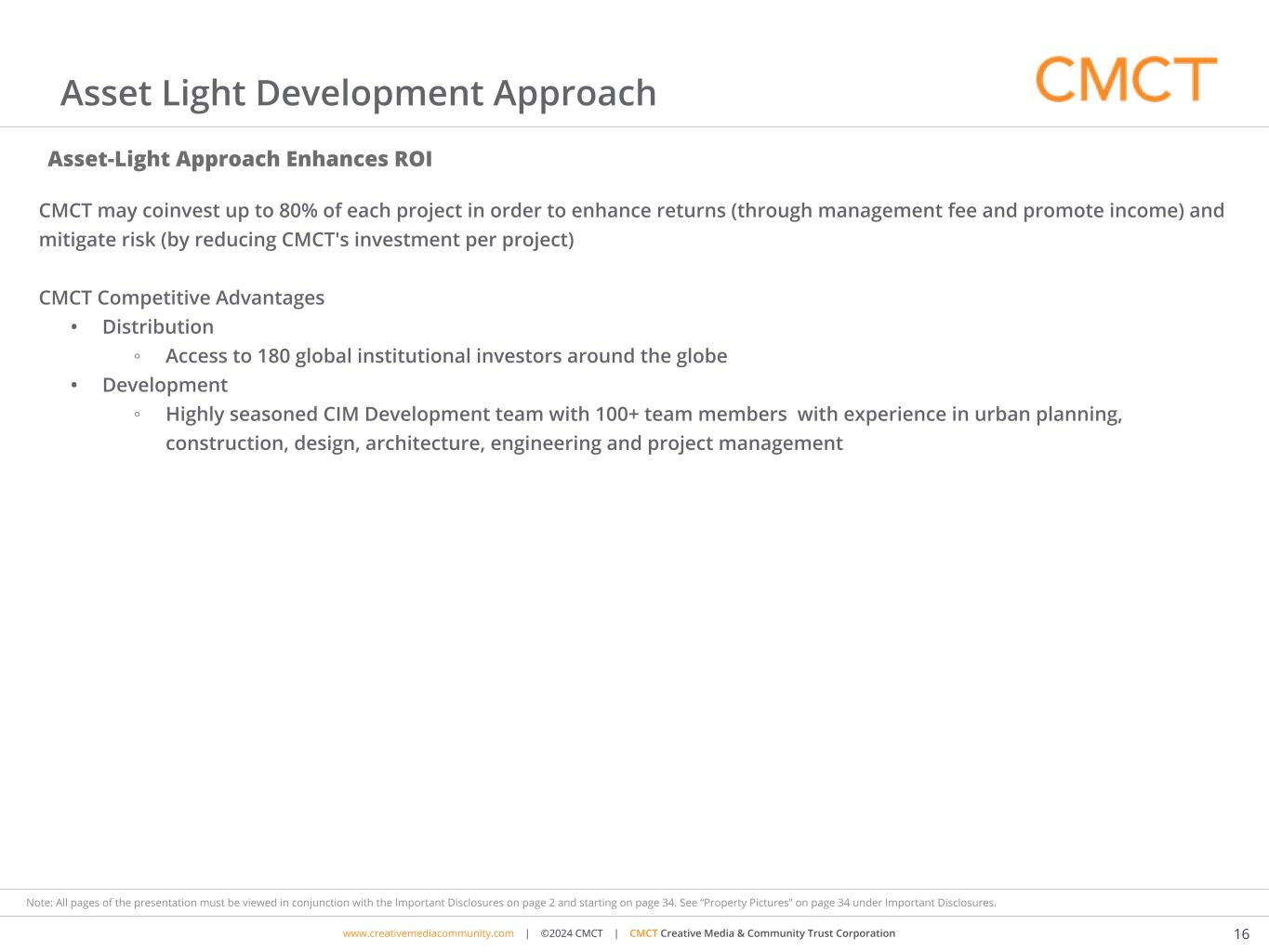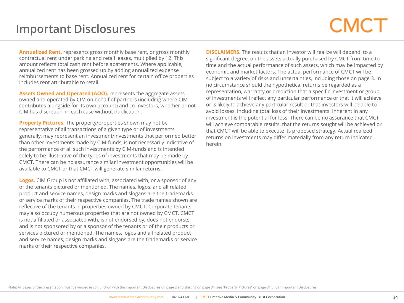 www.cimgroup.com |©2018年CIM集团|贸易机密/机密信息www.creativemediacommunity.com |©2024 CMCT | CMCTCreative Media & Community Trust Corporation 34注意:演示文稿的所有页面必须与第2页和从第34页开始的重要披露信息一起查看。请参阅第34页重要披露下的“物业图片”。重要披露年化租金。表示每月基本租金毛额,或停车场和零售租赁项下的每月合同租金毛额,乘以12。这一数额反映了减征前的现金租金总额。在适用的情况下,年化租金已通过在基本租金中加上年化费用报销而累计。某些办公物业的年化租金包括归属于零售的租金。资产拥有和运营(AOO)。代表CIM代表合作伙伴(包括CIM为自己的账户一起出资的情况)和共同投资者拥有和运营的总资产,无论CIM是否拥有酌处权,在每种情况下均不重复。物业图片。所显示的财产/物业可能并不代表特定类型的所有交易或一般投资,可能代表一项表现优于中集基金进行的其他投资的投资/投资,不一定代表中集基金进行的所有此类投资的表现,仅旨在说明CMCT可能进行的投资类型。无法保证CMCT将有类似的投资机会,或者CMCT将产生类似的回报。标志。CIM集团不隶属于或关联于任何被描述或提到的租户,也不是其赞助商。名称、标识,以及所有相关的产品和服务名称、设计标记和标语,均为各自公司的商标或服务标记。显示的商品名称反映了CMCT拥有的物业中的租户。公司租户还可能占用众多非CMCT所有的物业。CMCT与上述租户或其产品或服务没有关联或关联,不是由其背书,也不是背书,也不是由其赞助或被描述或提到的租户或其产品或服务的赞助商。名称、标识及所有相关产品和服务名称、设计标记和标语为各自公司的商标或服务标记。免责声明。投资者将实现的结果将在很大程度上取决于CMCT不时实际购买的资产以及此类资产的实际表现,这可能会受到经济和市场因素的影响。CMCT的实际履行将受到多种风险和不确定性的影响,其中包括第3页所述的风险和不确定性。在任何情况下,假设回报都不应被视为一项特定投资或一组投资将反映任何特定业绩或其将实现或可能实现任何特定结果或投资者将能够避免损失,包括其投资的全部损失的陈述、保证或预测。任何投资所固有的就是潜在的损失。无法保证CMCT将取得可比结果,无法保证将实现所寻求的回报,也无法保证CMCT将能够执行其提议的战略。实际实现的投资回报可能与此处所示的任何回报存在重大差异。