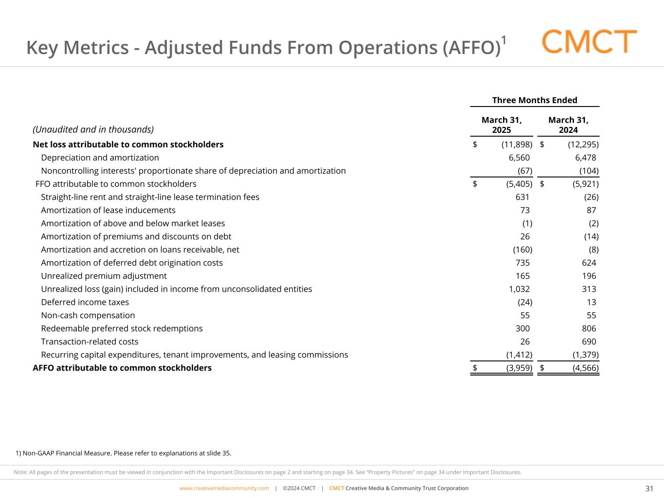 www.cimgroup.com |©2018年CIM集团|贸易秘密/机密信息www.creativemediacommunity.com |©2024 CMCT | CMCTCreative Media & Community Trust Corporation 31注意:演示文稿的所有页面必须与第2页和从第34页开始的重要披露信息一起查看。请参阅第34页重要披露下的“物业图片”。关键指标-调整后的运营资金(AFFO)11)非GAAP财务指标。请参考幻灯片35的说明。截至三个月(未经审计,单位:千)2025年3月31日2024年3月31日归属于普通股股东的净亏损$(11,898)$(12,295)折旧和摊销6,5606,478非控股权益在折旧和摊销中所占的比例(67)(104)归属于普通股股东的FFO $(5,405)$(5,921)直线租金和直线租赁终止费631(26)租赁诱因摊销7387高于和低于市场租赁摊销(1)(2)债务溢价和折价摊销26(14)应收贷款摊销和增值,净额(160)(8)递延债务发起成本摊销735624未实现溢价调整165196未实现损失(收益)计入未合并实体收入1,032313递延所得税(24)13非现金补偿5555可赎回优先股赎回300806交易相关成本26690经常性资本支出、租户改善和租赁佣金(1,412)(1,379)归属于普通股股东的AFFO $(3,959)$(4,566)