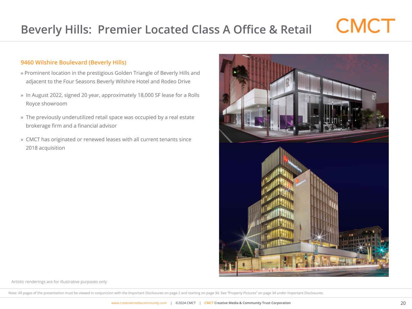 www.cimgroup.com |©2018年CIM集团|贸易秘密/机密信息www.creativemediacommunity.com |©2024 CMCT | CMCTCreative Media & Community Trust Corporation 20注:演示文稿的所有页面必须与第2页和从第34页开始的重要披露信息一起查看。请参阅第34页重要披露下的“物业图片”。比佛利山庄:卓越的甲级写字楼和零售9460 Wilshire Boulevard(比佛利山庄)»位于比佛利山庄久负盛名的金三角的显眼位置,毗邻四季比佛利威尔希尔酒店和Rodeo Drive » 2022年8月,签订了为期20年、约1.8万平方英尺的劳斯莱斯展厅租约»此前未得到充分利用的零售空间被一家房地产经纪公司和一名财务顾问占用»自2018年收购以来,CMCT已与所有当前租户发起或续签租约艺术效果图仅用于说明目的