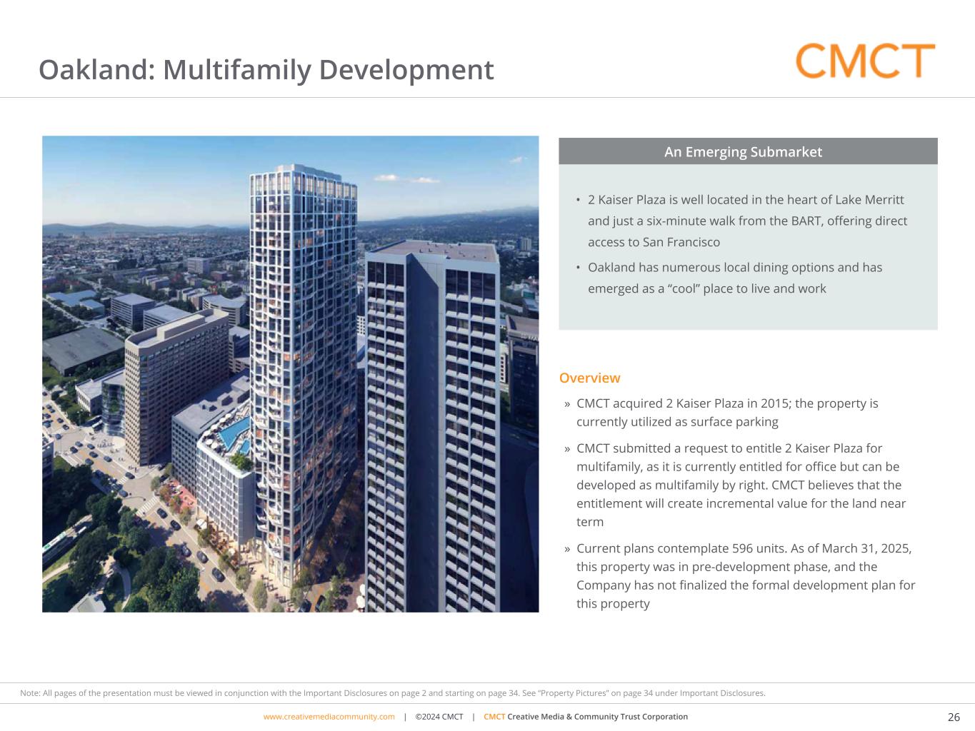 www.cimgroup.com |©2018年CIM集团|贸易秘密/机密信息www.creativemediacommunity.com |©2024 CMCT | CMCTCreative Media & Community Trust Corporation 25注意:演示文稿的所有页面必须与第2页并从第34页开始的重要披露信息一起查看。请参阅第34页重要披露下的“物业图片”。Jefferson Park:MultiFamily Development »在22年第一季度,CMCT以230万美元收购了3101 S. Western,该地块位于一块约1.13万平方英尺的土地上» CMCT考虑开发约40个住宅单元。截至2025年3月31日,这处房产处于前期开发阶段,公司尚未最终确定这处房产的正式开发计划»在2Q'22,CMCT以560万美元收购了3022 S. Western,该地块位于一块约2.83万平方英尺的地块上» CMCT正在考虑开发119个住宅单元。截至2025年3月31日,该物业处于前期开发阶段,公司尚未最终确定该物业的正式开发计划Culver City Los Angeles概览• Jefferson Park拥有各种住宅楼、商店、餐厅和办公室•毗邻West Adams社区,CIM自2016年以来在该社区翻新和开发了数十套公寓、餐厅和零售空间•方便地通往10号和110号高速公路•距离南加州大学1.5英里,距离卡尔弗市中心5.5英里,几家顶级科技和娱乐公司的所在地一个新兴子市场艺术效果图仅用于说明目的