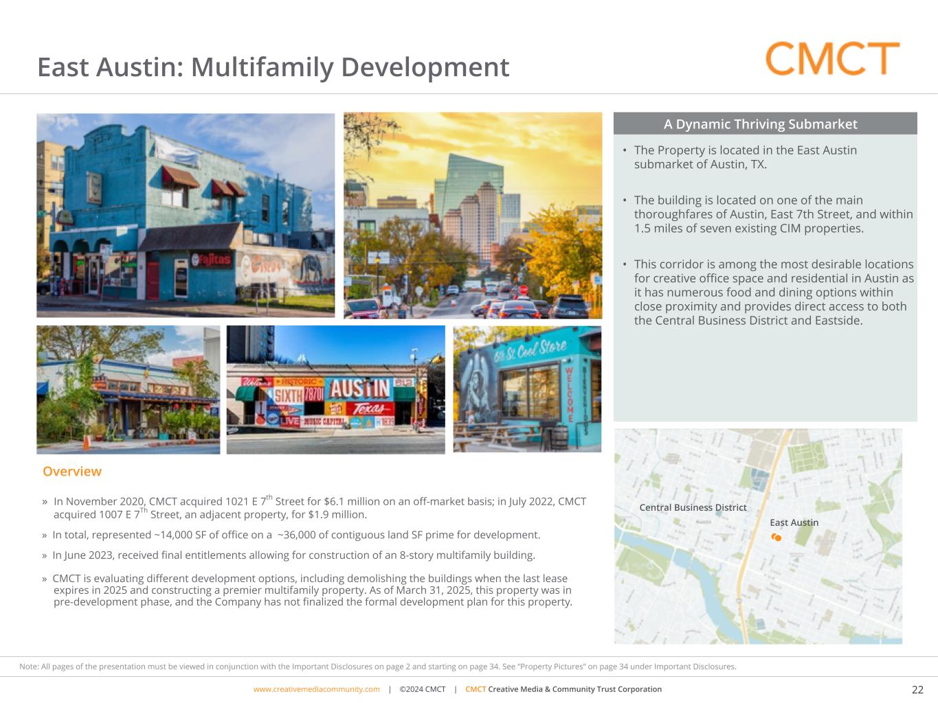 www.cimgroup.com |©2018年CIM集团|贸易机密/机密信息www.creativemediacommunity.com |©2024 CMCT | CMCTTERM1Creative Media & Community Trust Corporation 22注意:演示文稿的所有页面必须与第2页和从第34页开始的重要披露信息一起查看。请参阅第34页重要披露下的“物业图片”。East Austin:Multifamily Development •该物业位于德克萨斯州奥斯汀的East Austin子市场。•该建筑位于奥斯汀的主干道之一,东7街,距离CIM现有的7处房产不到1.5英里。•这条走廊是奥斯汀最理想的创意办公空间和住宅地点之一,因为它附近有许多食品和餐饮选择,可直接通往中央商务区和东区。一个充满活力、欣欣向荣的子市场概览中央商务区East Austin East Austin,Texas » 2020年11月,CMCT在场外以610万美元的价格收购了1021 E 7th Street;2022年7月,CMCT以190万美元收购了毗邻的房产1007 E 7th Street。»合计代表~1.4万SF办公在一块~3.6万的连片土地上SF prime for development。» 2023年6月,获得允许建造8层多户式建筑的最终权利。» CMCT正在评估不同的开发方案,包括在2025年最后一份租约到期时拆除这些建筑物,以及建造一座首屈一指的多户住宅。截至2025年3月31日,该物业处于前期开发阶段,公司尚未最终确定该物业的正式开发计划。