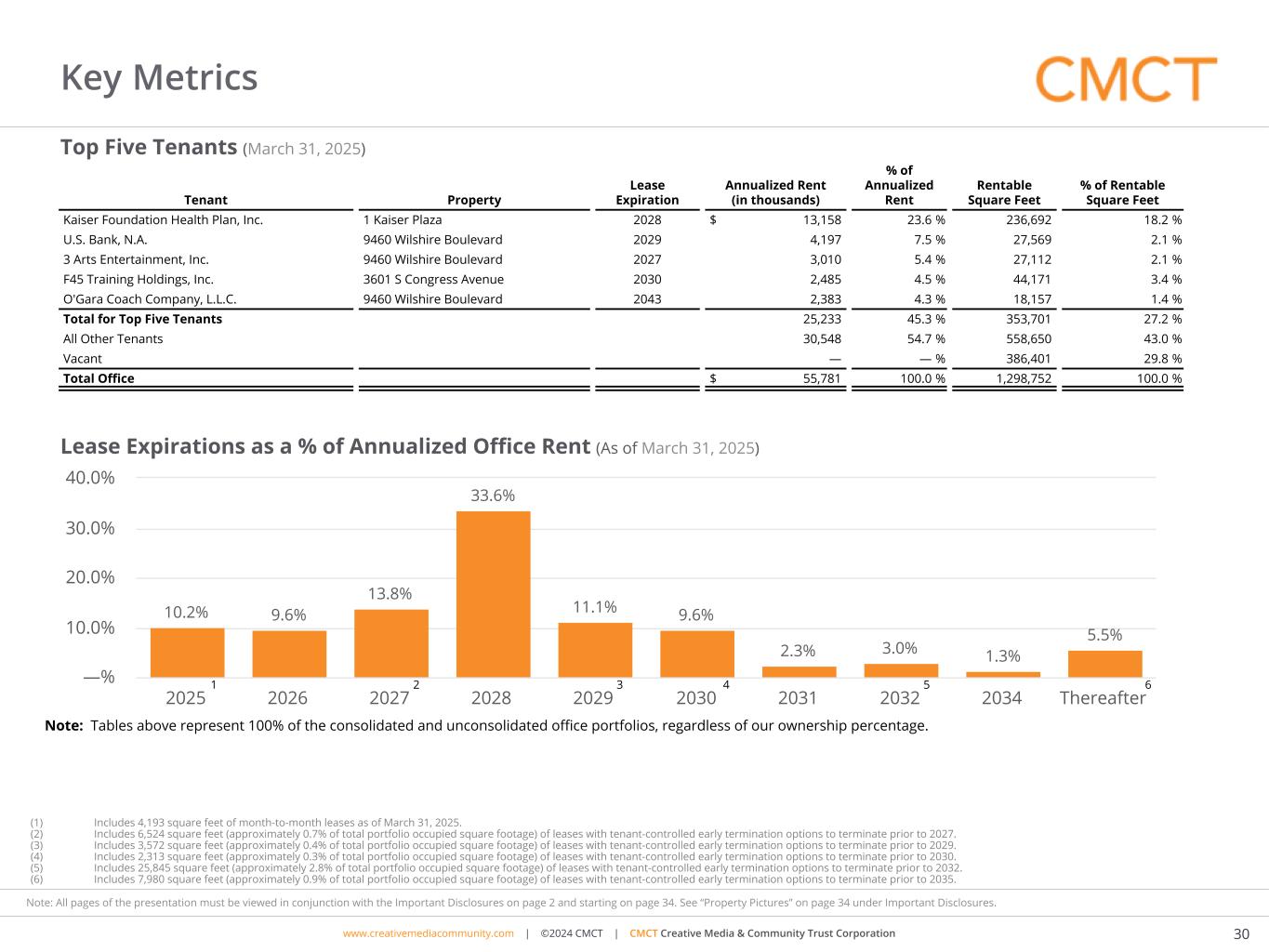www.cimgroup.com |©2018年CIM集团|贸易机密/机密信息www.creativemediacommunity.com |©2024 CMCT | CMCTCreative Media & Community Trust Corporation 30注意:演示文稿的所有页面必须与第2页和从第34页开始的重要披露信息一起查看。请参阅第34页重要披露下的“物业图片”。关键指标租约到期占年化办公室租金的百分比(截至2025年3月31日)前五大租户(2025年3月31日)(1)包括截至2025年3月31日的4,193平方英尺的月度租约。(2)包括6,524平方英尺(约占总投资组合占用面积的0.7%)的租约,租户控制的提前终止选择权将在2027年之前终止。(3)包括3,572平方英尺(约占总投资组合占用面积的0.4%)的租约,租户控制的提前终止选择权将在2029年之前终止。(4)包括2,313平方英尺(约占总投资组合占用面积的0.3%)的租约,租户控制的提前终止选择权将在2030年之前终止。(5)包括25845平方英尺(约占总投资组合占用面积的2.8%)的租约,租户控制的提前终止选择权可在2032年之前终止。(6)包括7,980平方英尺(约占总投资组合占用面积的0.9%)的租约,租户控制的提前终止选择权将在2035年之前终止。10.2% 9.6% 13.8% 33.6% 11.1% 9.6% 2.3% 3.0% 1.3% 5.5% 202520262027202820292030203120322034此后—% 10.0% 20.0% 30.0% 40.0%租户物业租赁到期年化租金(千)%年化租金可出租方英尺%可出租方英尺Kaiser Foundation Health Plan,Inc. 1 Kaiser Plaza 2028 $ 13,15823.6% 236,69218.2% U.S. Bank,N.A. 9460 Wilshire Boulevard 20294,1977.5% 27,569 2.1% 3 Arts Entertainment,Inc. 9460 Wilshire Boulevard 20273,0 105.4% 27,1122.1% F45 Training控股,Inc. 3601 S Congress Avenue 2030 2,4854.5% 44,1713.4% O'Gara Coach Company,L.L.C. 9460 Wilshire Boulevard 20432,3834.3% 18,1571.4% Total for Top Five Tenants 25,23345.3% 353,70127.2% All Other Tenants 30,54854.7% 558,65043.0% Vacant ——% 386,40129.8% Total Office $ 55,781 100.0% 1,298,752100.0% 1注:上表代表100%的合并和未合并办公室组合,无论我们的所有权百分比如何。3 54 62