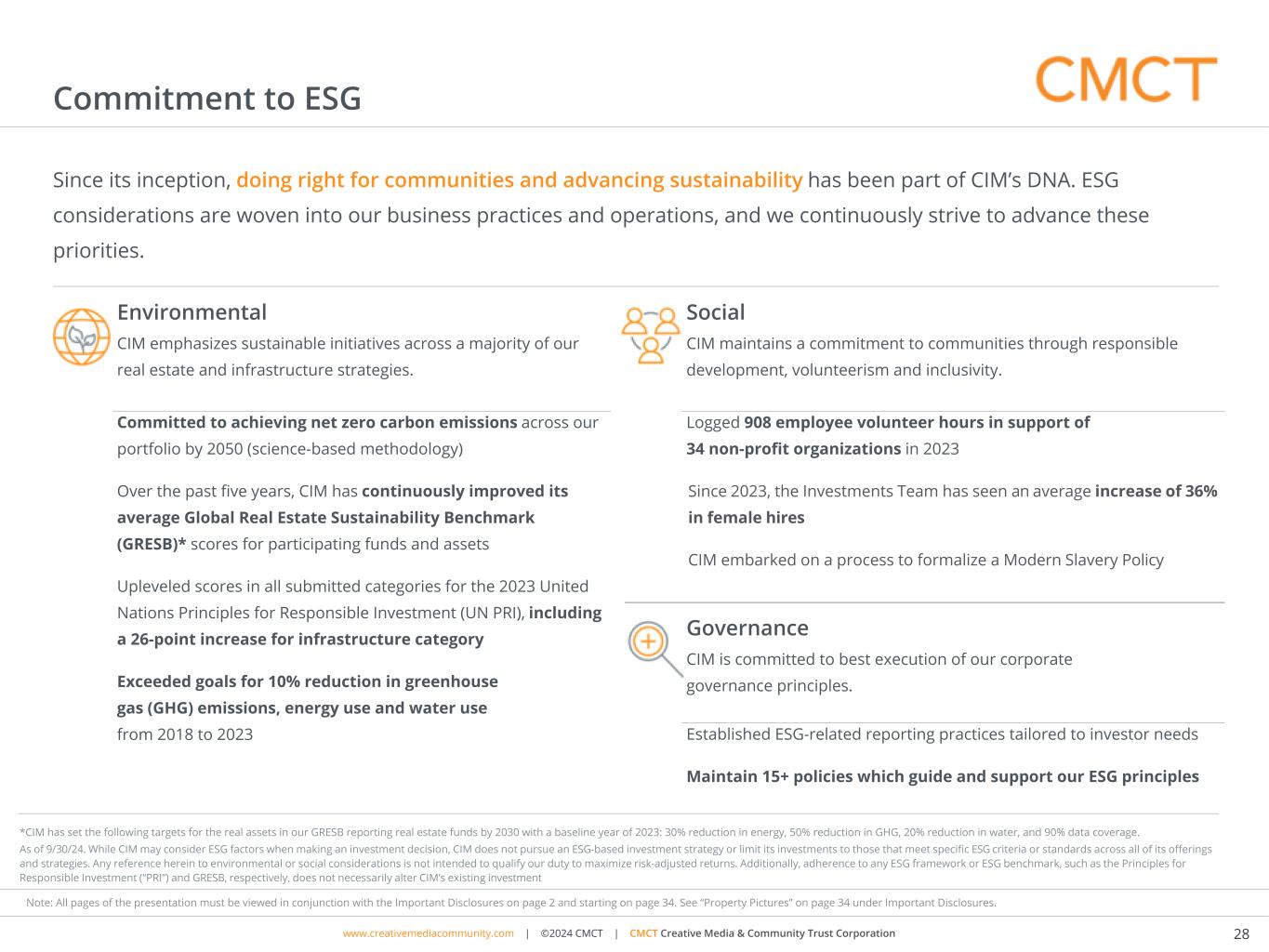 www.cimgroup.com |©2018年CIM集团|贸易机密/机密信息www.creativemediacommunity.com |©2024 CMCT | CMCTCreative Media & Community Trust Corporation 28注意:演示文稿的所有页面必须与第2页和从第34页开始的重要披露信息一起查看。请参阅第34页重要披露下的“物业图片”。对ESG的承诺自成立以来,为社区做正确的事并推进可持续发展一直是CIM DNA的一部分。ESG考虑因素融入了我们的业务实践和运营,我们不断努力推进这些优先事项。环境CIM强调我们大多数房地产和基础设施战略中的可持续举措。致力于到2050年在我们的投资组合中实现净零碳排放(基于科学的方法)在过去五年中,CIM不断提高其平均全球房地产可持续发展基准(GRESB)*参与基金和资产的得分提高了2023年联合国责任投资原则(UN PRI)所有提交类别的得分,包括基础设施类别的得分提高26分,使2018年至2023年温室气体(GHG)排放、能源使用和用水减少10%的目标超出预期。社会CIM通过负责任的发展、志愿服务和包容性保持对社区的承诺。2023年记录了908个员工志愿者小时,支持34个非营利组织自2023年以来,投资团队看到女性雇员平均增加了36% CIM开始了正式制定现代奴隶制政策治理的过程CIM致力于以最佳方式执行我们的公司治理原则。为投资者需求量身定制的既定ESG相关报告实践维护15 +项政策,指导和支持我们的ESG原则*CIM为我们以2023年为基准年的GRESB报告房地产基金中的真实资产在2030年前设定了以下目标:能源减少30%,GHG减少50%,水减少20%,数据覆盖率90%。截至9/30/24。虽然CIM在做出投资决策时可能会考虑ESG因素,但CIM不追求基于ESG的投资策略,也不将其投资限制在其所有产品和策略中符合特定ESG标准或标准的投资。本文中对环境或社会考虑的任何提及均无意限定我们最大化风险调整后回报的职责。此外,遵守任何ESG框架或ESG基准,例如《责任投资原则》(“PRI”)和GRESB,并不一定会改变CIM现有的投资