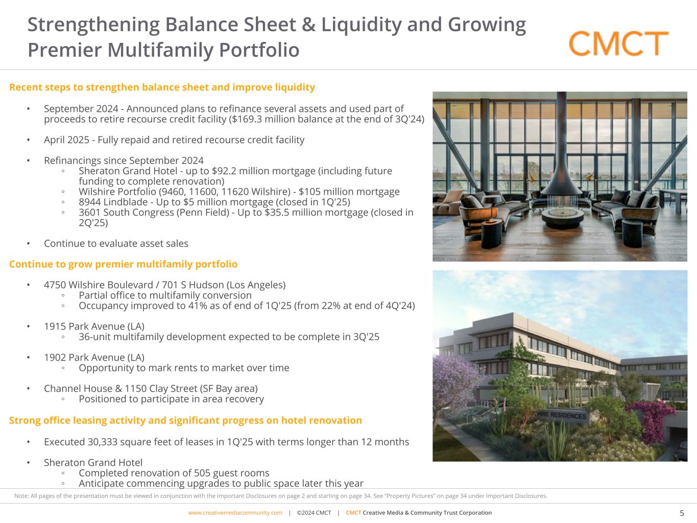 www.cimgroup.com |©2018年CIM集团|贸易秘密/机密信息www.creativemediacommunity.com |©2024 CMCT | CMCTCreative Media & Community Trust Corporation 4注意:演示文稿的所有页面必须与第2页和从第34页开始的重要披露信息一起查看。请参阅第34页重要披露下的“物业图片”。过去的表现并不能保证未来的结果。1)见第38页向股东返还的资本。2)截至2025年3月31日的财产统计。包括合资企业。截至2025年3月31日的租赁百分比。3)包括位于Wilshire Boulevard 4750号的物业部分,该部分已转换为68个多户单元(“701 S Hudson”)。Creative Media & Community Trust CorporationCMCT主要专注于在充满活力的新兴社区收购、拥有、运营和开发创意办公和一流的多户家庭资产。NASDAQ:CMCT | TASE:CMCTLending Division Subsidiary通过SBA7(a)担保贷款计划CMCT Portfolio2 • Office Portfolio 12 Class A and Creative Office Properties 71.4% of Lented合计• Multifamily Portfolio 4 Premier Class A multifamily Properties(764 total units)31 Premier Class A multifamily properties under development(36 total units)• Hotel 1 hotel with an adjacent parking garage(Sacramento)• Development Pipeline(Primarily Multifamily)additional development opportunities in Austin(two),奥克兰(三个)和萨克拉门托2019年:CMCT出售了八座建筑,总计约220万平方英尺的传统办公空间,并保持其创意和甲级办公资产组合。所得款项用于偿还债务,并派发每股42美元的特别股息。2022年:宣布投资努力,专注于一流的多户家庭和创意办公资产,以迎合娱乐和科技等高增长行业。奥克兰奥斯汀洛杉矶旧金山