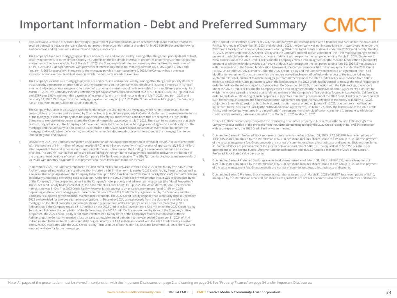 www.cimgroup.com |©2018年CIM集团|贸易秘密/机密信息www.creativemediacommunity.com |©2024 CMCT | CMCTCreative Media & Community Trust Corporation 33注意:演示文稿的所有页面必须与第2页和从第34页开始的重要披露信息一起查看。请参阅第34页重要披露下的“物业图片”。重要信息-债务和优先摘要截至2024年前三季度末,公司未遵守2022年信贷融资项下的财务契约。此外,截至2024年12月31日及2025年3月31日,公司未遵守2022年信贷融资项下的两项契诺。2024年期间的此类不合规事件构成2022年信贷安排项下的违约事件。2024年5月14日,2022年信贷融资项下的贷款人与公司订立一项协议(“第一次修改协议”),据此,贷款人就截至2024年3月31日的测试期放弃该违约事件。于2024年8月7日,2022年信贷融资项下的贷款人与公司订立一项协议(“第二次修改协议”),据此,贷款人就截至2024年6月30日的测试期放弃该违约事件。在执行第二份修改协议的同时,公司根据2022年信贷安排偿还了400万美元。2024年10月24日,2022年信贷融资项下的贷款人与公司订立一项协议(“第三次修改协议”),据此,贷款人在截至2024年9月30日的测试期内免除此类违约事件,据此,2022年信贷融资项下的总承付款从2.062亿美元减少至1.693亿美元,据此,2022年信贷融资项下的贷款人同意解除酒店物业,以促进此类物业的再融资。2024年12月24日,就再融资而言,2022年信贷融资项下的贷款人与公司订立一项协议(“第四次修改协议”),据此,贷款人同意解除与公司位于加利福尼亚州洛杉矶的三座办公楼有关的资产,以促进此类物业的再融资,但须遵守与此类再融资相关的2022年信贷融资的最低预付款。此外,第四次修改协议将贷款到期日改为2025年1月31日,但有2个月的延期选择权。该延期选择权于2025年1月31日根据2022年信贷融资的修改协议(“第五次修改协议”)执行。于2025年3月27日,2022年信贷融资项下的贷款人与公司订立一项修改协议(“第六次修改协议”),据此,信贷融资的到期日由2025年3月31日延长至2025年5月31日。2025年4月3日,公司完成了德克萨斯州奥斯汀一处办公物业的再融资(“奥斯汀再融资”)。公司将奥斯汀再融资的部分收益用于全额偿还2022年信贷融资,就此类偿还而言,2022年信贷融资被终止。6.已发行的A1系列优先股代表截至2025年3月31日已发行的股份总数为12,240,878股,减去赎回的3,148,815股,乘以每股25.00美元的规定价值。包括向中集集团发行股份代替现金支付资产管理费。总收益不扣除佣金、费用、分配成本或折扣。A1系列优先股的股息按(i)年利率6.0%(即每季度相当于每股0.3750美元)和(ii)该季度联邦基金(有效)利率中的较高者支付,再加上2.5%,最高可达每季度A1系列优先股规定价值的2.5%。7.A系列优先股代表截至2025年3月31日已发行的股份总数为8,820,338股,减去赎回的4,799,446股,乘以每股25.00美元的规定价值。包括向中集集团发行股份代替现金支付资产管理费。总收益不扣除佣金、费用、分配成本或折扣。8.已发行的D系列优先股代表截至2025年3月31日已发行的总股份为56,857股,减去赎回的8,410股,乘以每股25.00美元的规定价值。总收益不扣除佣金、费用、分配成本或折扣。1.不包括:(a)130万美元的担保借款–政府担保贷款,指已售贷款,由于贷款销售未达到ASC 860-30《担保借款和抵押品》中规定的终止确认标准,因此被视为有担保借款,以及(b)溢价, 折扣和发债成本。2.公司的应付固定利率抵押为无追索权,并由(其中包括)有关该等抵押及应收租金转让基础物业的收费单利的第一优先信托契据、担保协议或其他类似担保文书作担保。截至2025年3月31日,公司应付固定利率抵押贷款的固定年利率分别为4.14%、6.25%和7.41%,仅支付利息,初始到期日分别为2026年7月1日、2025年6月7日和2030年1月11日。就于2025年6月7日到期的应付按揭而言,公司拥有可酌情行使的一年延期选择权(公司拟行使)。3.公司应付的浮动利率抵押贷款是无追索权的,并由(其中包括)公司在其酒店资产和相邻停车场的收费简单和租赁权益上的第一优先信托契约、担保协议或其他类似担保文书以及由多户物业的应收租金的信托契约和转让提供担保。截至2025年3月31日,公司应付浮动利率抵押贷款的浮动利率为SOFR加3.36%、SOFR加4.35%和SOFR加3.00%,仅按月支付利息,初始到期日为2025年7月7日、2027年1月1日和2027年2月14日。就于2025年7月7日到期的应付按揭(“通道房屋按揭”)而言,公司在若干条件下拥有延期选择权。公司一直在与Channel House Mortgage下的贷方进行讨论,该抵押贷款是无追索权的,没有交叉抵押品条款,并由Channel House(加利福尼亚州奥克兰的多户家庭财产)担保,以重组抵押贷款的条款,因为公司预计该财产将不会满足公司行使将Channel House Mortgage延长至2025年7月7日之后的选择权所要求的某些条件。不能保证这种重组会发生。倘公司与Channel House Mortgage项下的贷款人无法就抵押的修改达成一致且公司未能行使其延期选择权,则该等失败将构成抵押项下的违约事件,并将允许贷款人(除其他补救措施外)宣布抵押贷款项下的本金和利息立即到期应付。4.2023年3月9日,公司通过发行5410万美元的无担保SBA7(a)贷款支持票据(在支付与证券化相关的费用和开支以及准备金账户和托管账户的资金后,净收益约为4330万美元),完成了其SBA7(a)应收贷款的某些未担保部分的证券化。SBA7(a)贷款支持票据以收取可归属于公司SB