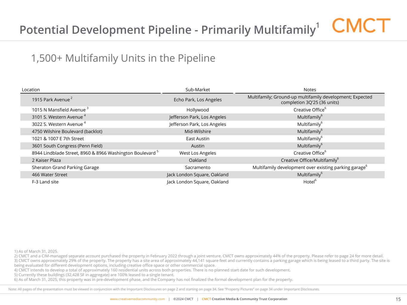 www.cimgroup.com |©2018年CIM集团|贸易机密/机密信息www.creativemediacommunity.com |©2024 CMCT | CMCTCreative Media & Community Trust Corporation 14注意:演示文稿的所有页面必须与第2页和从第34页开始的重要披露信息一起查看。请参阅第34页重要披露下的“物业图片”。1)指截至2025年3月31日开始的租约下的每月基本租金毛额乘以十二。这一数额反映了优惠前的现金租金总额。2)指截至2025年3月31日开始的租约下的每月基本租金毛额除以已占用单位。这一数额反映了优惠前的现金租金总额。扣除规定期间给予的租金优惠,每个占用单元的月租金为2341美元。3)701 S Hudson代表位于威尔希尔大道4750号物业的多户家庭部分。4)表示截至2025年3月31日的过去12个月的入住率,计算方法为已入住房间数除以可用房间数。Premier Multifamily and Hotel Multifamily Portfiolio Classification/Market/Property Sub-Market Units % Occupied Annualized Rent(in Thousands)1 Monthly Rent per Occupied Unit2 Consolidated Office Portfolio Oakland,加利福尼亚州 Channel House Jack London Distict 33384.7% $ 8,738 $ 2,5821150 Clay Downtown 28881.6% 6,9092,450 Total Consolidated Multifamily Portfolio 62183.3% $ 15,647 $ 2,522 Unconsolidated加利福尼亚州 1902 Park Avenue-25.5% Echo Park 7590.7% $ 1,549 $ 1,898701 S Hudson3-20% Mid-Wilshire 6841.2% 9092,707 Total Unconsolidated Multifamily Portfolio 14367.1% $ 2,458 $ 2,134 Total Multifamily Portfolio 76480.2% $ 18,105 $ 2,461 Hotel & Parking Garage Location/Property Sub-Market % Occupied4 RevPAR Sacramento,⑤ Sheraton Grand Hotel Downtown/Midtown 80.0% $ 176.47 Sheraton Grand Hotel Parking Garage & Retail Downtown/Midtown 81.0% NA