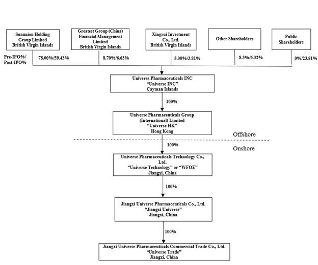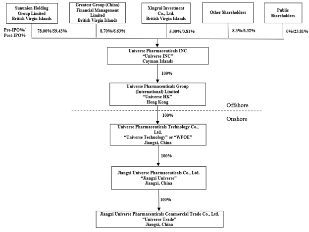 With the growth of our business and in order to facilitate international capital investment in our Company, we underwent an offshore reorganization in 2019 and 2020. On December 11, 2019, our holding company, Universe Pharmaceuticals INC (“Universe INC”), was incorporated under the laws of the Cayman Islands as an exempted company with limited liability. Our wholly-owned subsidiary Universe Pharmaceuticals Group (International) Limited (“Universe HK”) was formed in Hong Kong on May 21, 2014 as an intermediate holding company. Universe HK in turn holds all the capital stock of Jiangxi Universe Pharmaceuticals Technology Co., Ltd. (“Universe Technology”), a wholly foreign owned enterprise incorporated in China on Aril 4, 2019. Universe Technology holds all the capital stock and controls Jiangxi Universe. Jiangxi Universe holds a 100% equity interest in Universe Trade.
