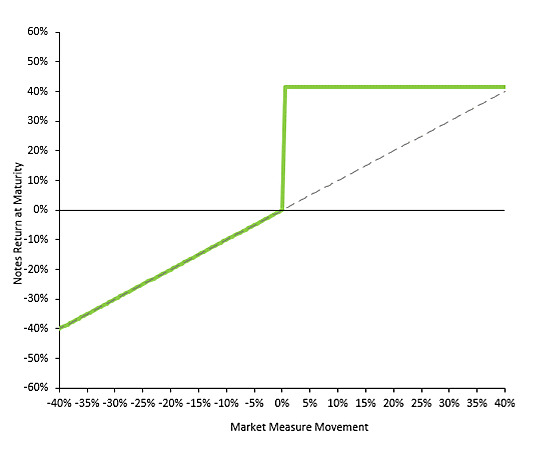 这张图表反映了票据的回报,基于100%的起始值和每单位4.15美元的数字支付的门槛值。绿线反映票据的回报,而虚线灰线反映直接投资于基础股票的回报,不包括股息。