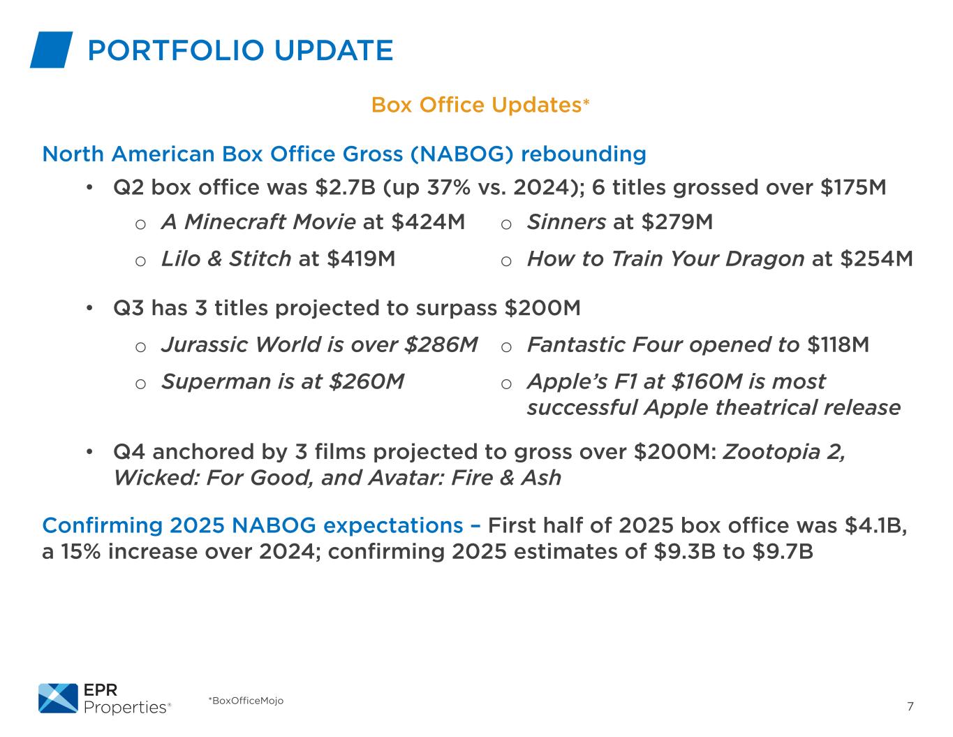 7*BoxOfficeMojo投资组合更新票房更新*北美票房总收入(NABOG)反弹• Q2票房为$ 2.7B(与2024年相比增长37%);6部影片票房超过1.75亿美元• Q3有3部影片预计票房超过2亿美元• Q4由3部预计票房超过2亿美元的电影锚定:《疯狂动物城2》、《Wicked:For Good》和《阿凡达:Fire & Ash》证实了2025年NABOG的预期– 2025年上半年票房为$ 4.1B,比2024年增长15%;确认2025年估计的9.3B至9.7B美元o一部4.24亿美元的《我的世界》电影o Lilo & Stitch 4.19亿美元o罪人2.79亿美元o如何以2.54亿美元驯龙o侏罗纪世界超过2.86亿美元o超人2.6亿美元o神奇四侠开到1.18亿美元o苹果的F1以1.6亿美元上映是最成功的苹果影院上映