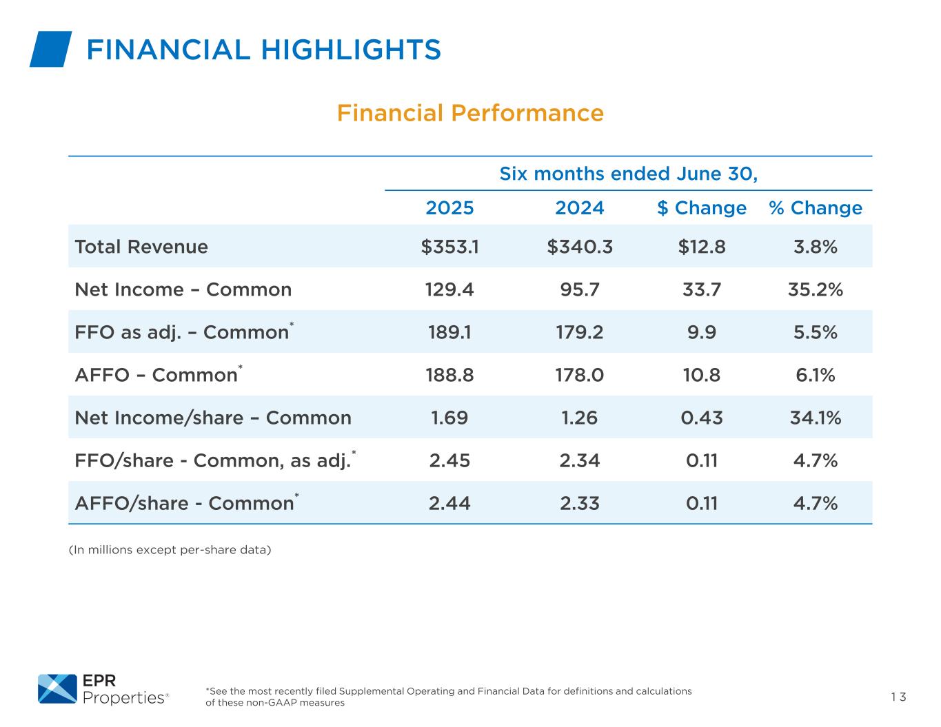 1 3*有关这些非公认会计原则措施的定义和计算,请参阅最近提交的补充运营和财务数据财务亮点(以百万计,每股数据除外)财务业绩截至2025年6月30日的六个月2024年$变动%变化总收入$ 353.1 $ 340.3 $ 12.8 3.8%净收入–共同129.495.73 3.7 35.2% FFO as adj. –共同*189.1179.29.99.5.5% AFFO – Common*188.81 78.0 10.86.1%净收益/股–普通1.69 1.26 0.43 34.1% FFO/股-普通,如调整后。*2.45 2.34 0.11 4.7% AFFO/股-普通*2.44 2.33 0.11 4.7%