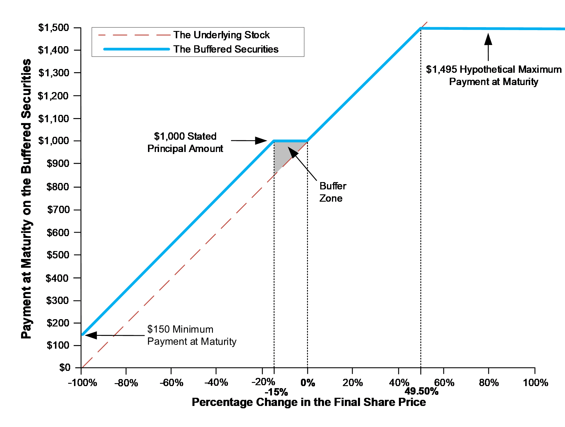 此次发售的缓冲证券为摩根士丹利 Finance LLC(“MSFL”)的无担保债务,并由摩根士丹利提供全额无条件担保。缓冲证券将不支付利息,在到期时仅提供规定本金金额的15%的最低付款,并具有随附的参与证券产品补充和招股说明书中描述的条款,经本文件补充或修改。到期时,如果标的股票已经升值,投资者将获得其投资的规定本金金额加上反映标的股票100%上涨表现的回报,但以到期时的最高支付额为准。如果标的股票贬值,但标的股票跌幅未超过规定的缓冲金额,缓冲证券将赎回面值。但如果标的股票跌幅超过缓冲金额,投资者每超过规定的缓冲金额下跌1%,将损失1%,但须遵守规定本金金额的15%的最低到期付款。投资者可能会损失高达缓冲证券规定本金金额的85%。缓冲证券适用于寻求基于权益的回报并愿意承担本金风险并放弃当前收益和到期时高于最高支付的上行空间以换取适用于标的股票有限表现范围的缓冲特性的投资者。缓冲证券是作为MSFL A系列全球中期票据计划的一部分发行的票据。
