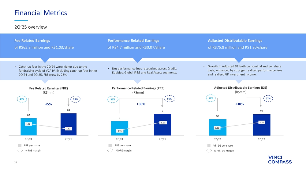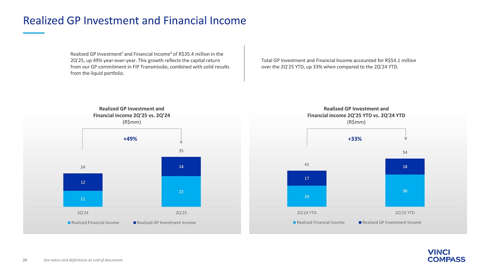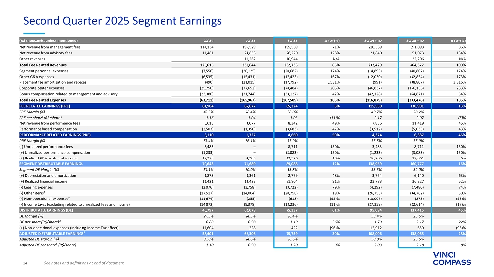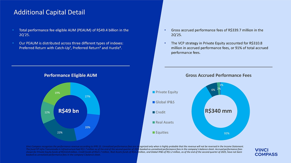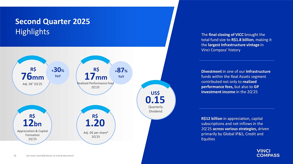 1376毫米Adj. DE‘25 2Q’25 17毫米已实现绩效费2Q‘25 0.15季度股息120亿美元升值和资本形成2Q’25 R $ + 87% YoY + 30% YoY 1.20 Adj. DE.13 2 Q'25 R $ 2025年第二季度亮点R $ R $ VICC的最终收盘使基金总规模达到18亿雷亚尔,使其成为Vinci Compass历史上最大的基础设施年份剥离我们在不动产部门的一个基础设施基金,不仅贡献了已实现的绩效费,此外,2Q’25各战略的120亿雷亚尔升值、资本认购和2Q’25净流入的GP投资收入,主要由全球知识产权、信贷和股票驱动见文件末尾的注释和定义