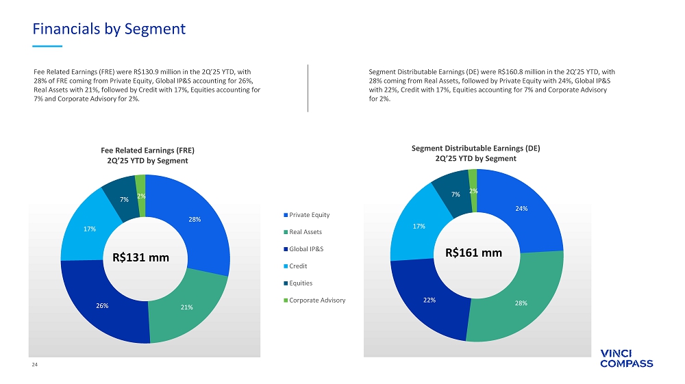 24财务按分部费用相关收益(FRE)2Q‘25年初至今按分部分部可分配收益(DE)2Q’25年初至今按分部费用相关收益(FRE)为1.309亿雷亚尔2Q'25年初至今,28%的FRE来自私募股权,全球IP & S占26%,Real Assets占21%,其次是Credit占17%,Equities占7%,Corporate Advisory占2%。2Q'25 YTD的分部可分配收益(DE)为1.608亿雷亚尔,28%来自实物资产,其次是私募股权24%、全球IP & S 22%、信贷17%、股票占比7%和企业咨询2%。161mm雷亚尔131mm雷亚尔28% 21% 26% 17% 7% 2% 24% 28% 22% 17% 7% 2%私募股权实物资产全球IP & S信贷股票企业咨询