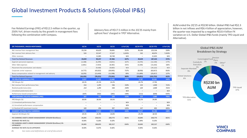 25见文件末尾的注释和定义TPD Liquid 47% TPD Alternative 31% Global Solutions 8% Separate Mandate 8% Custody & Execution 3% MINGLED Fund 1% Pension Plans 1% Other丨1% Global IP & S AUM按战略划分Global Investment Products & Solutions(Global IP & S)本季度2300亿雷亚尔AUM费用相关收益(FRE)为1250万雷亚尔,同比增长250%,主要是由于与Compass合并后管理费的增长。2Q'25的咨询费为1750万雷亚尔,主要来自在TPD ²替代方案中收取的前期费用丨。↓同比(%)2Q‘25年初至今2Q’24年初至今丨同比(%)2Q‘25 1Q’25 2Q'24(千雷亚尔,除非提及)220% 125,31639,106212% 59,69165,62519,134来自管理费的净收入7,433% 40,0745323,245% 17,52722,547524来自顾问费的净收入不适用21,833 –不适用10,74811,085 –其他收入372% 187,22339,639347% 87,96699,25719,659与费用相关的总收入177%(12,140)(4,376)167%(5,841)(6,299)(2,188)分部人员费用180%(15,426)(5,508)191%(8,383)(7,043)(2,881)其他G & A费用不适用(19,122)–不适用(9,683)(9,及回扣816%(82,017)(8,958)737%(39,995)(42,022)(4,777)企业中心开支127%(25,017)(11,009)85%(11,598)(13,419)(6,255)与管理层有关的奖金补偿415%(153,722)(29,851)369%(75,501)(78,221)(16,101)费用相关费用总额242% 33,5019,787250% 12,46621,0353,557与费用相关的收益(FRE)17.9% 24.7% 14.2% 21.2% 18.1% FRE利润率(%)721% 1,830223150% 5361,295214业绩费净收入721% 1,830223150% 5361,295214已实现业绩费用N/A –– N/A ––未实现业绩费用645%(828)(111)148%(265)(562)(107)基于业绩的薪酬795% 1,003112153% 270732107业绩相关收益(PR(-)未实现业绩费用不适用––不适用––(+)未实现业绩报酬205% 692227135% 397296169(+)已实现GP投资收益248% 35,19610,127243% 13,13322,0633,834分部可分配收益18.5% 25.3% 14.8% 21.9% 19.1%分部DE Margin(%)821% 228,77324,845821% 228,773230,55124,845管理下的收费盈利资产(百万雷亚尔)0.13% 0.34% 0.13% 0.33% 0.33%平均费率(%)634% 182,31724,845634% 182,317180,85524,834,817,845,817,845,817,845,845,845,845,845,845,845,845,845,EX-UPFRONTS AUM截至2Q'25为2300亿雷亚尔。Global IP & S有23亿雷亚尔的净流入和64亿雷亚尔的升值,然而,本季度受到美元Global IP & S基金(主要是TPD Liquid和Alternative)104亿雷亚尔的负外汇变动的影响。