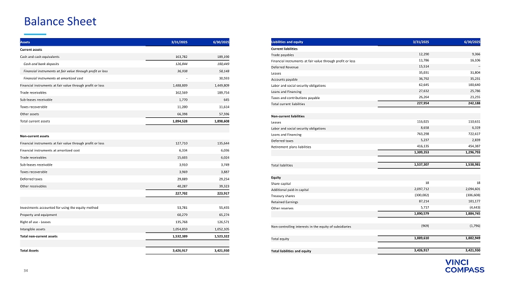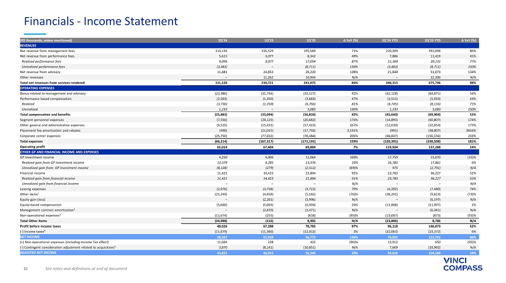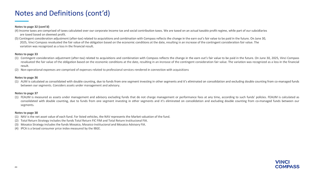 44第32页注释(续)(4)所得税由我们的企业所得税和社会贡献税计算的税款组成。我们按实际应税利润制度征税,而我们的部分子公司按视同利润征税。(5)与收购和与Compass合并相关的或有对价调整(税后)反映了未来将支付的收益公允价值的变化。2025年6月30日,Vinci Compass根据当日的经济状况对债务的公允价值进行了重新估值,导致或有对价公允价值增加。该变动在财务业绩中确认为亏损。第33页附注(1)与收购和与Compass合并相关的或有对价调整(税后)反映了未来将支付的收益公允价值的变化。2025年6月30日,Vinci Compass根据当日的经济状况对债务的公允价值进行了重新估值,导致或有对价公允价值增加。该变动在财务业绩中确认为亏损。(2)非运营费用包括与收购相关的专业服务相关的费用第36页注(1)AUM按重复计算合并计算,原因是来自一个分部的资金投资于其他分部,并且在合并时已消除,不包括我们分部之间共同管理基金的重复计算。考虑管理和咨询资产。第37(1)页注释FEAUM根据此类基金的政策,计量为管理和咨询下的资产,不包括在任何时候不收取管理费或绩效费的基金。FEAUM的计算方法是合并重复计算,这是由于来自一个部门的资金投资于其他部门,它在合并时被消除,并且不包括我们部门之间共同管理基金的重复计算。第38(1)页附注NAV为每只基金的资产净值。对于上市车辆,NAV代表基金的市场估值。(2)总回报策略包括基金总回报FIC FIM和总回报制度型FIA。(3)Mosaico Strategy包括基金Mosaico、Mosaico Institucional和Mosaico Advisory FIA。(4)IPCA是IBGE衡量的广泛的消费者价格指数。Notes and Definitions(cont’d)