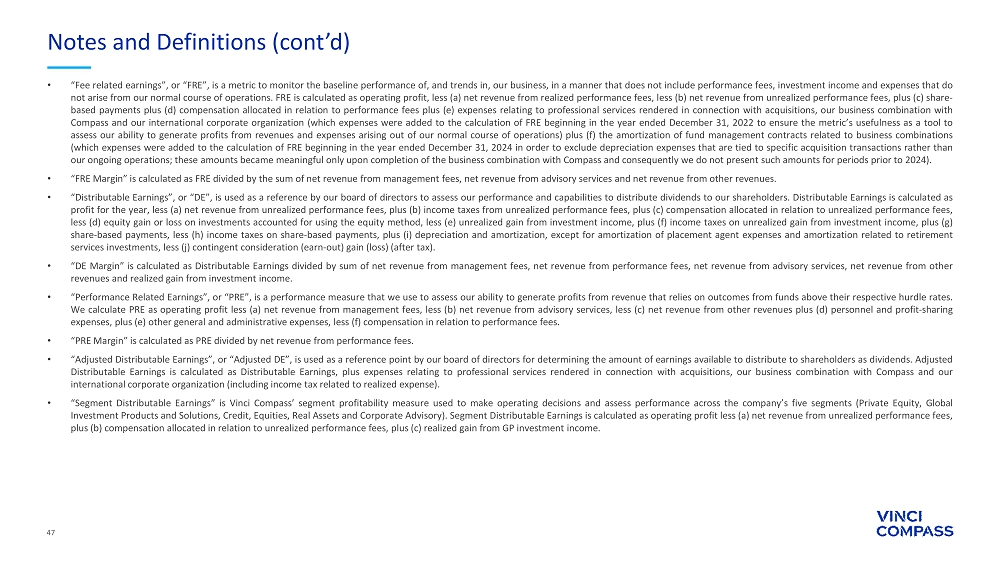 47 •“与费用相关的收益”,即“FRE”,是一种监测我们业务的基线业绩和趋势的指标,其方式不包括业绩费用、投资收入和不是由我们的正常运营过程产生的费用。FRE的计算方法为营业利润,减去(a)已实现绩效费的净收入,减去(b)未实现绩效费的净收入,再加上(c)以股份为基础的付款加上(d)与绩效费相关的分配补偿加上(e)与收购、我们与Compass和我们的国际公司组织的业务合并相关的专业服务相关的费用(这些费用已从12月31日终了年度开始的FRE计算中加入,2022年,以确保该指标作为评估我们从正常经营过程中产生的收入和费用中产生利润的能力的工具的有用性)加上(f)与业务合并相关的基金管理合同的摊销(这些费用已被添加到12月31日止年度开始的FRE计算中,2024年,以排除与特定收购交易相关的折旧费用,而不是我们的持续运营;这些金额只有在完成与Compass的业务合并后才有意义,因此我们不会在2024年之前的期间提供此类金额)。•“FRE保证金”的计算方法是FRE除以管理费净收入、咨询服务净收入和其他收入净收入之和。•“可分配收益”,即“DE”,是我们董事会用来评估我们向股东分配股息的表现和能力的参考。可分配收益的计算方法为当年利润,减去(a)未实现绩效费的净收入,加上(b)未实现绩效费的所得税,加上(c)与未实现绩效费相关的分配补偿,减去(d)使用权益法核算的投资的权益损益,减去(e)投资收益的未实现收益,再加上(f)投资收益的未实现收益的所得税,加上(g)以股份为基础的付款,减去(h)以股份为基础的付款的所得税,再加上(i)折旧和摊销,除配售代理费用摊销及与退休服务投资有关的摊销外,减(j)或有对价(盈利)收益(亏损)(税后)。•“DEMargin”的计算方法是,可分配收益除以管理费净收入、绩效费净收入、咨询服务净收入、其他收入净收入和投资收益已实现收益之和。•“与业绩相关的收益”,或“PRE”,是一种绩效衡量标准,我们用来评估我们从依赖于高于各自门槛率的基金的结果的收入中产生利润的能力。我们将PRE计算为营业利润减去(a)来自管理费的净收入,减去(b)来自咨询服务的净收入,减去(c)来自其他收入的净收入加上(d)人员和利润分享费用,加上(e)其他一般和行政费用,减去(f)与绩效费相关的薪酬。•“PRE利润率”的计算方法是PRE除以来自绩效费的净收入。•“调整后的可分配收益”或“调整后的DE”被我们的董事会用作确定可作为股息分配给股东的收益金额的参考点。调整后的可分配收益计算为可分配收益,加上与收购、我们与Compass的业务合并以及我们的国际公司组织相关的专业服务相关的费用(包括与已实现费用相关的所得税)。•“分部可分配收益”是Vinci Compass的分部盈利能力衡量标准,用于制定经营决策并评估公司五个分部(私募股权、全球投资产品和解决方案、信贷、股票、实物资产和企业咨询)的业绩。分部可分配收益的计算方法为营业利润减去(a)未实现绩效费的净收入,加上(b)与未实现绩效费相关的分配补偿,再加上(c)来自GP投资收益的已实现收益。注释和定义(续)