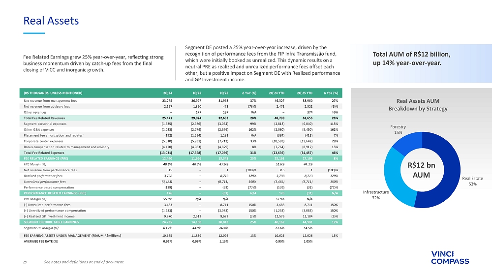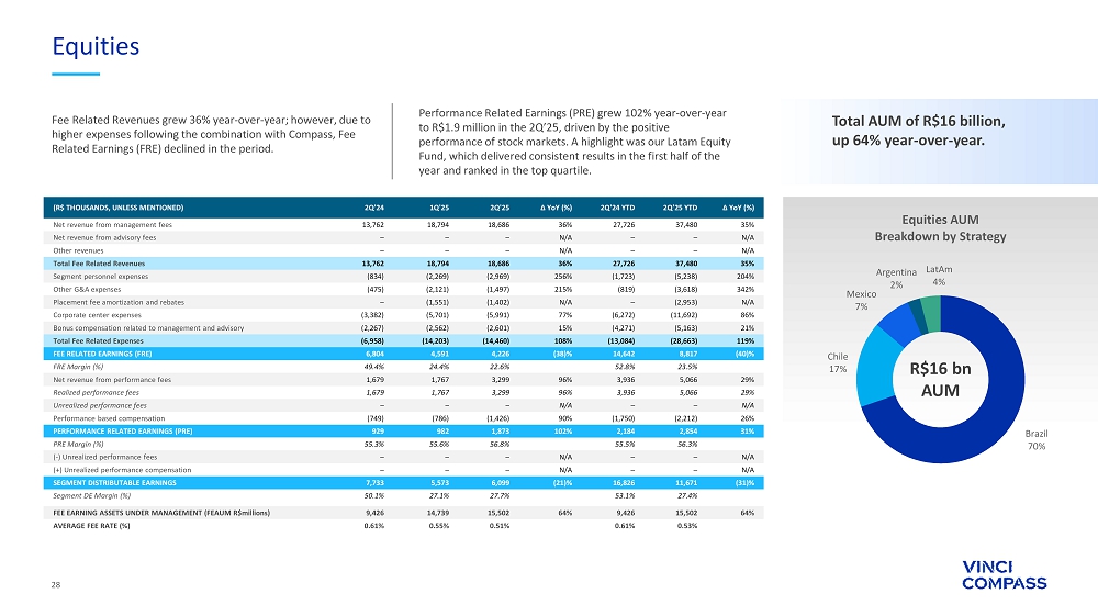 27 VCP III 55% VCP IV 19% VCP II 16% VIR IV 6%其他4%私募股权AUM按旗舰私募股权分类的160亿雷亚尔AUM总AUM为160亿雷亚尔,同比增长2%。本季度费用相关收益(FRE)总计1760万雷亚尔,同比下降40%。这一下降完全是由于VCP IV战略在该季度的强劲筹资在24年第二季度确认的追赶费用,该战略于24年第四季度结束,因此在2025年没有再次发生。剔除这一影响,仅考虑经常性管理费,FRE同比增长21%。7月,我们的VCP团队完成了对AGV的收购,使VCP IV的资本部署达到总承诺的约40%。该团队继续寻找新的投资机会进行部署,并寻求跨基金II和III的退出,而我们的VIR团队则专注于构建我们的下一个影响力投资年份,VIR V. ↓ YoY(%)2Q‘25年初至今2Q’24年初至今丨YoY(%)2Q‘25 1Q’25 2Q'24(千雷亚尔,除非提及)(11)% 62,00569,764(29)% 30,71031,29443,480管理费净收入不适用––不适用––顾问费净收入不适用––不适用––其他收入(11)% 62,00569,764(29)% 30,71031,29443,480费用相关总收入9%(2,346)(2,146)9%(1,178)(1,168)(1,080)分部人员费用28%(2,191)(1,716)18%(1,393)(798)(1,183)其他G & A费用20%(730)(607)22%(363)(367)(298)安置费摊销及回扣2%(12,550)(12,334)(5)%(6,518)(6,032)(6,884)企业中心开支(7)%(7,134)(7,677)(20)%(3,636)(3,497)(4,571)与管理层有关的奖金补偿及顾问2%(24,949)(24,481)(7)%(13,088)(11,861)(14,017)费用相关费用总额(18)% 37,05545,284(40)% 17,62219,43329,464与费用相关的收益(FRE)59.8% 64.9% 57.4% 62.1% 67.8% FRE Margin(%)N/A –– N/A –– Net revenue from performance fees N/A –– N/A ––已实现绩效费N/A ––未实现绩效费N/A ––基于绩效的薪酬N/A –– N/A ––与业绩相关的收益(预)N/A N/A N/A(-)未实现业绩费用不适用––不适用––(+)未实现业绩报酬不适用1,692 –不适用1,692 ––(+)已实现GP投资收益(14)% 38,74745,284(34)% 19,31419,43329,464分部可分配收益60.8% 64.9% 59.6% 62.1% 67.8%分部DE利润率(%)3% 12,71012,3853% 12,71013,28712,385管理下的收费盈利资产(百万雷亚尔)1.00% 1.29% 1.01% 1.00% 1.57%平均费率(%)