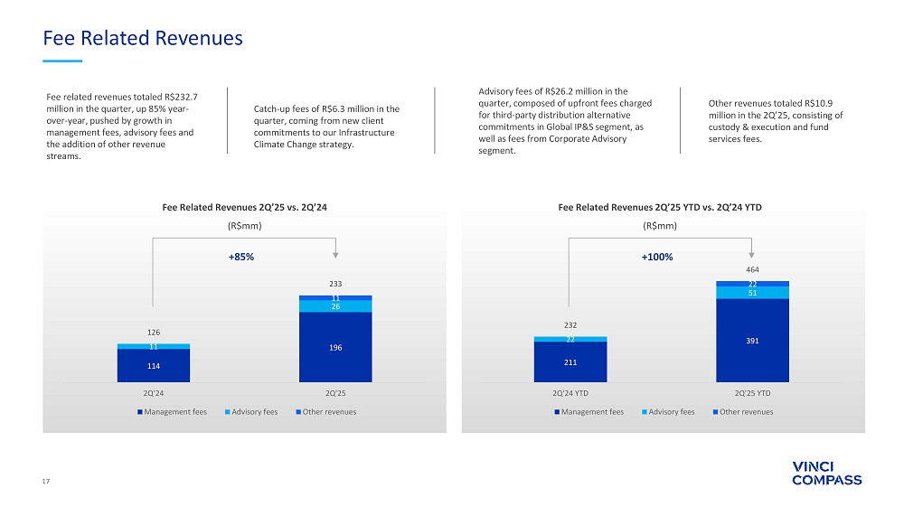 16Vinci Compass根据IFRS 15确认履约收入。只有当收入很可能不会在损益表中转回时,才会确认未实现的业绩费用。截至2025年第二季度末,基础设施中的基金FIP Infra Transmiss ã o有170万雷亚尔作为未实现的业绩费用记入COMPany的资产负债表。截至2025年第二季度末,私募股权基金3.108亿雷亚尔、信贷基金2170万雷亚尔、实物资产基金420万雷亚尔、GL OBA L IP & S 120万雷亚尔的应计绩效费尚未在公司资产负债表中作为未实现绩效费入账。额外资本详情92% 6% 2% 1% • 2Q'25符合条件的业绩费AUM(PEAUM)总额为494亿雷亚尔。•我们的PEAUM分布于三种不同类型的指数:Preferred Return with Catch-Up丨、Preferred Return ²和Hurdle ↓。• 25年第二季度应计履约费用毛额为3.397亿雷亚尔。•私募股权中的VCP策略产生了3.108亿雷亚尔的应计绩效费,占应计绩效费总额的91%。符合业绩要求的AUM 340毫米雷亚尔27% 20% 22% 12% 19%私募股权全球IP & S信贷实物资产股票毛应计业绩费用490亿雷亚尔